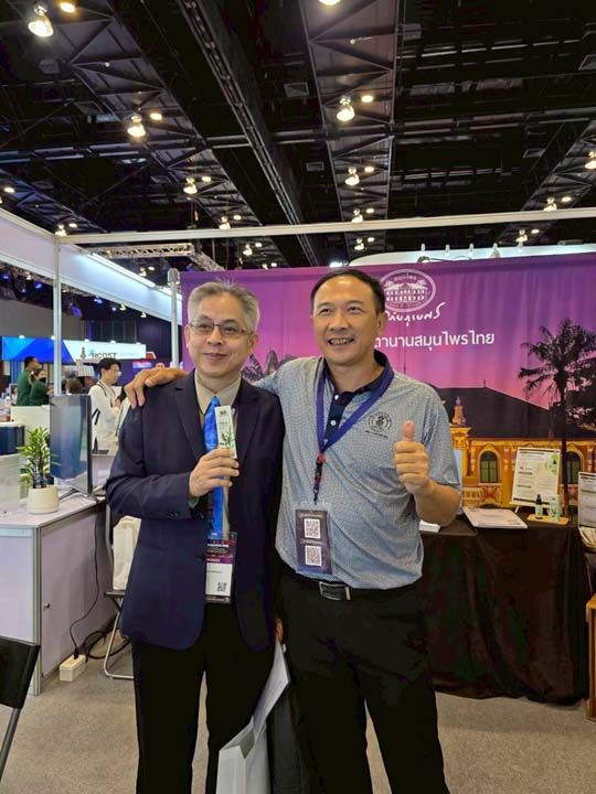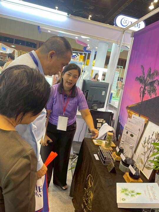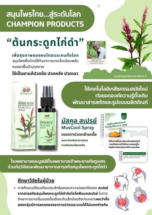 “มัสคูลสเปรย์ เป็นยาสมุนไพรในบัญชียาหลักแห่งชาติที่สามารถเบิกจ่ายได้ทุกสิทธิการรักษา โดยภายในบูธได้จัดแสดงเส้นทางการพัฒนาผลิตภัณฑ์ ตั้งแต่ต้นสมุนไพร “กระดูกไก่ดำ (Justicia gendarussa)” ทั้งในรูปต้นจริงและต้นแห้ง กระบวนการสกัดสารสำคัญ การพัฒนาเป็นผลิตภัณฑ์รูปแบบสเปรย์ และการควบคุมคุณภาพตามมาตรฐาน GMP PIC/S”