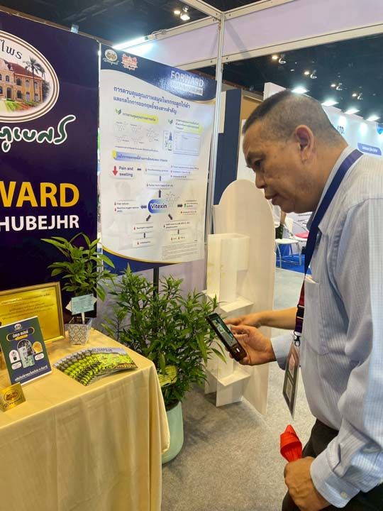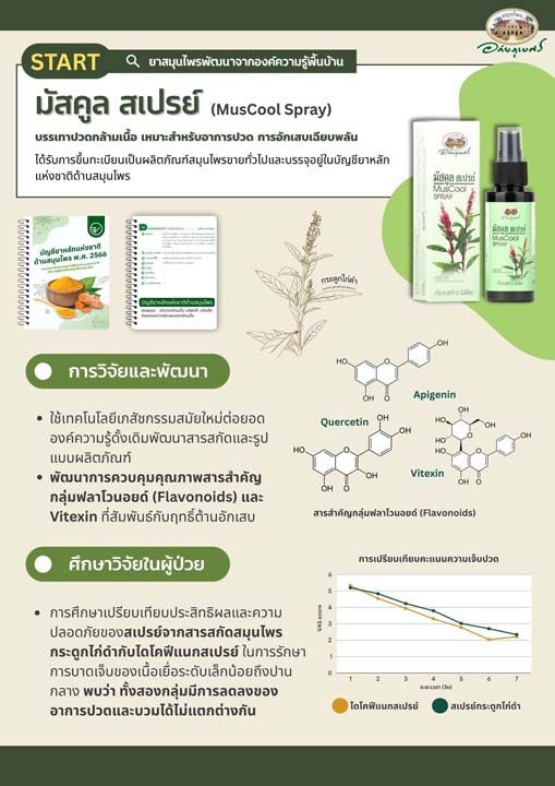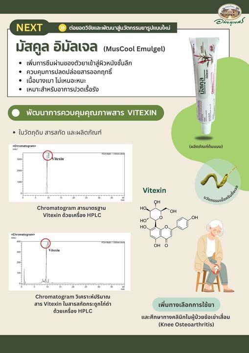 นอกจากนี้ยังมีการนำเสนอผลงานวิจัยด้านกลไกการออกฤทธิ์และการตรวจวิเคราะห์คุณภาพสารออกฤทธิ์ทั้ง Total flavonoids และ Vitexin ซึ่งได้รับความสนใจจากแพทย์ออร์โธปิดิกส์เป็นอย่างมาก โดยหลายท่านแสดงความชื่นชมที่ผลิตภัณฑ์สมุนไพรไทยมีงานวิจัยรองรับเทียบเท่ากับยาแผนปัจจุบัน กลุ่ม topical NSAIDs และสามารถใช้ในระบบหลักประกันสุขภาพได้จริง