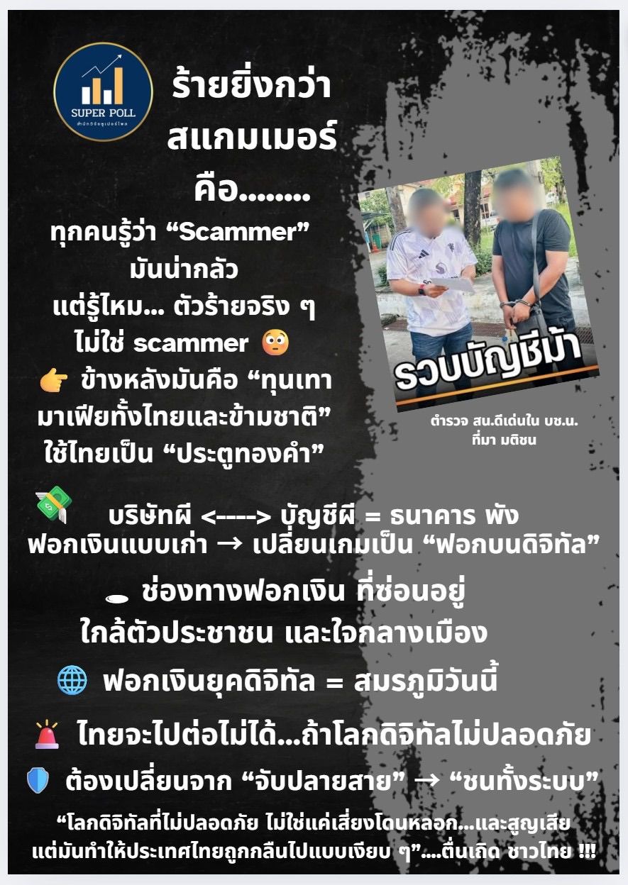 ถ้าเรายังมองปัญหานี้เพียงแค่ในระดับปลายสายโทรศัพท์มือถือ ข่าวปลอมหรือเฟคนิวส์ หรือบอท บนแพลตฟอร์มออนไลน์ เราจะไม่มีวันเห็นขบวนการเบื้องหลังที่กำลังซ่อนตัวอยู่ในระบบการเงิน ดิจิทัล และสถาบันหลักของประเทศประเทศไทยจะไม่สามารถ “ไปต่อ” ได้อย่างมั่นคงจะพบจุดจบที่ไม่มีใครคาดถึง หากโลกดิจิทัลยังไม่ปลอดภัยและความเชื่อมั่นศรัทธายังถูกบั่นทอน ติดตามต่อได้ที่ www.superpoll.co.th โทร 02.082.2646