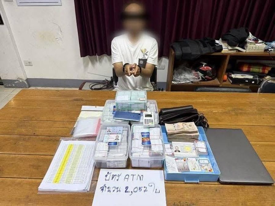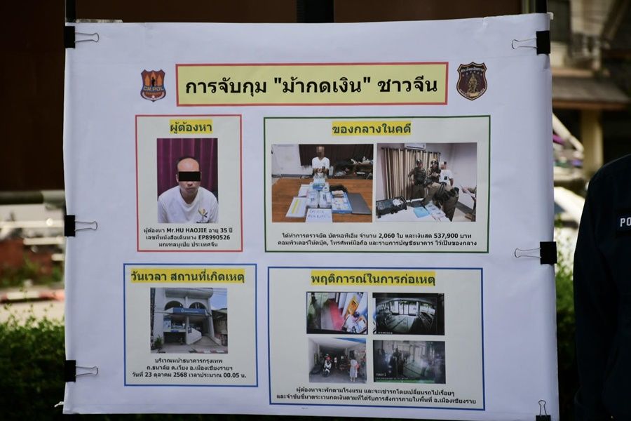 สำหรับการจัมกุมชายชาวจีน พร้อมบัตรเอทีเอ็ม 2,057 ใบ เกิดขึ้นเมื่อวันที่ 23 ตุลาคม 2568 เวลาประมาณ 00.04 น. เจ้าหน้าที่ตำรวจชุดจับกุม สภ.เมืองเชียงราย ออกตรวจ พื้นที่บริเวณหน้าธนาคารกรุงเทพ ถนนธนาลัย ตำบลเวียง อำเภอเมืองเชียงราย พบชายชาวจีนมีท่าทางพิรุธ เมื่อเรียกตรวจได้พยายามวิ่งหลบหนี ทางเจ้าหน้าที่ตำรวจได้ควบคุมตัวเอาไว้ ในเบื้องต้นทราบชื่อคือ Mr. HU HAOJIE อายุ 35 ปี สัญชาติจีน ตรวจค้นพบบัตรเอทีเอ็ม หลายธนาคาร และสลิปโอนเงินหลายรายการ จึงควบคุมตัวสอบสวน