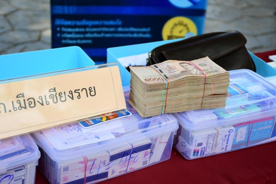 อีกราย เจ้าหน้าที่ตำรวจ สภ.เชียงแสน ได้รับแจ้งจากสายลับว่าจะมีการลักลอบส่งสมุดบัญชี บัตรอิเล็กทรอนิกส์ และซิมการ์ด ผ่านบริษัทขนส่ง เอกชน เพื่อส่งต่อไปประเทศลาว โดยฝากไว้ที่จุดฝากรถหน้าด่านสามเหลี่ยมทองคำ อ.เชียงแสน จ.เชียงราย ตำรวจจึงวางกำลังซุ่มตรวจ จนพบรถขนส่งบริษัทเอกชน นำพัสดุมาส่ง มีชายชื่อ นายรุ่งโรจน์ รับพัสดุไป เจ้าหน้าที่จึงแสดงตัวตรวจค้นพบของกลางเป็นสมุดบัญชี บัตรอิเล็กทรอนิกส์ และซิมการ์ดจำนวนมาก ต่อมาเจ้าหน้าที่ขยายผลตรวจยึดพัสดุเพิ่มเติมจากบริษัทเอกชนในพื้นที่ พบของกลางลักษณะ เดียวกันหลายรายการ เครือข่ายนี้เกี่ยวข้องกับการลักลอบส่งบัญชีและบัตรไปให้กลุ่ม “จีนเทา” ที่ลาว เพื่อใช้ในแก๊งสแกม เมอร์สร้างความเสียหายแก่ประชาชน โดยตำรวจภูธรจังหวัดเชียงราย จะเร่งขยายผลและยึดทรัพย์เครือข่ายตามนโยบาย รัฐบาลและผู้บัญชาการตำรวจแห่งชาติ