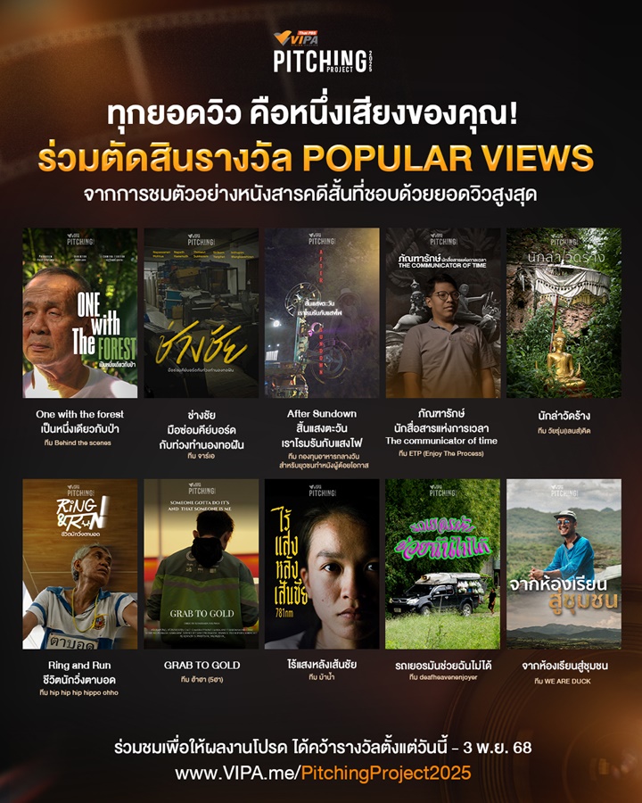 VIPA Pitching Project 2025 เปิดพื้นที่ให้ประชาชนร่วมเป็นส่วนหนึ่งในการตามหาหนังสารคดีสั้นที่ “ใช่” ผ่านการชม “ตัวอย่างหนังสารคดีสั้น” จากผลงานของนักสร้างสรรค์หน้าใหม่ทั้ง 10 ทีม ที่จะพาทุกคนไปสัมผัสเรื่องราวหลากหลาย ทั้งป่า ธรรมชาติ ชีวิตคนรุ่นใหม่ ไปจนถึงความเชื่อและแรงบันดาลใจจากทั่วไทย ร่วมโหวตง่าย ๆ เพียงแค่เข้าไปรับชมตัวอย่างหนังสารคดีสั้นที่ www.VIPA.me/PitchingProject2025 แล้วเลือกดูเรื่องที่คุณชอบ 1 ยอดวิว = 1 เสียงโหวต ทีมใดมียอดวิวสูงสุด รับไปเลย ! รางวัล Popular Views ซึ่งจะประกาศผลในงาน VIPA Film Fest 2025 (8 พ.ย. 68) ณ House Samyan ร่วมรับชมและโหวตได้ตั้งแต่ วันนี้ – 3 พ.ย. 68 ผู้ร่วมโหวตมีสิทธิ์ลุ้นรับเสื้อ VIPA สุดพิเศษ จำนวน 10 รางวัล ประกาศรายชื่อผู้โชคดี 4 พ.ย. 68 ทาง Facebook @VIPAdotMe