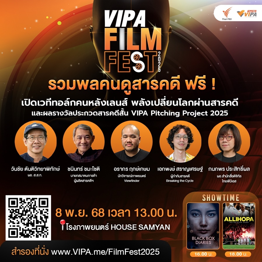 ไทยพีบีเอสชวนคนรักหนังสารคดี ร่วมงาน “VIPA FILM FEST 2025” 8 พ.ย.นี้ ลุ้นผลตัดสิน Pitching ฟังเสวนาคนหลังเลนส์ ชมสารคดีพรีเมียมฟรี !