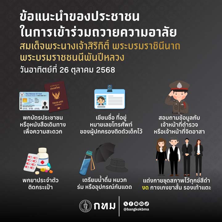 26 ตุลาคม 2568 กรุงเทพมหานคร เชิญชวนประชาชนเข้าร่วมถวายความอาลัย สมเด็จพระนางเจ้าสิริกิติ์ พระบรมราชินีนาถ พระบรมราชชนนีพันปีหลวง วันอาทิตย์ที่ 26 ตุลาคม 2568 โดยมีข้อแนะนำ ดังนี้