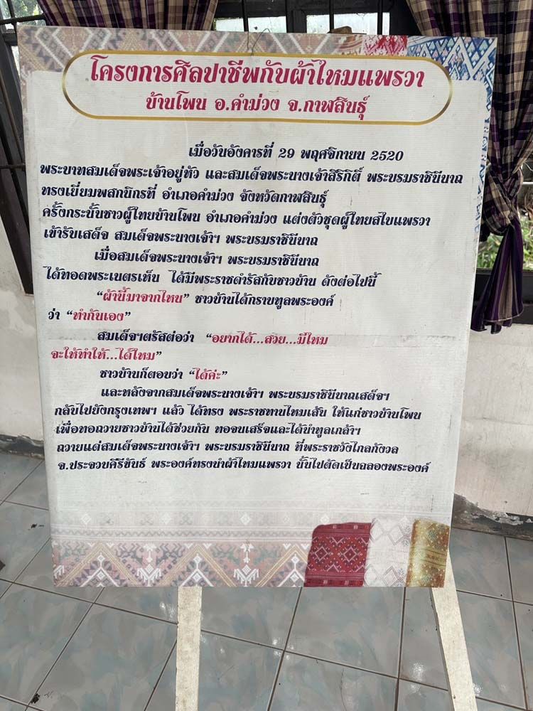 เมื่อวันที่ 26 ตุลาคม 2568 ที่โครงการส่งเสริมการทอผ้าไหมแพรวาบ้านโพน มูลนิธิส่งเสริมศิลปชีพในสมเด็จพระนางเจ้าสิริกิติ์พระบรมราชินีนาถ ซึ่งเริ่มต้นโครงการเมื่อปีพุทธศักราช 2521 โดยบรรยากาศการสวรรคตของ สมเด็จพระนางเจ้าสิริกิติ์ พระบรมราชินีนาถ พระบรมราชชนนีพันปีหลวง ทำให้ชาวบ้านโพนของที่นี่ โดยเฉพาะกลุ่มสตรีชาวผู้ไทยบ้านโพน ต่างพากันเศร้าโศกเสียใจและร่วมกันน้อมถวายอาลัยอย่างยิ่ง