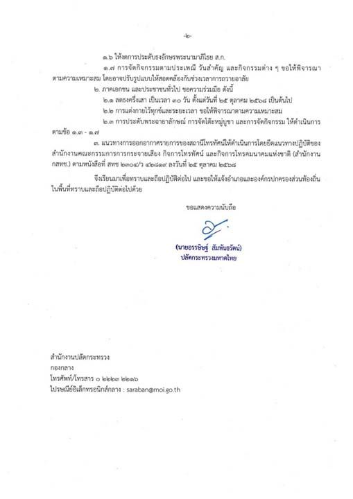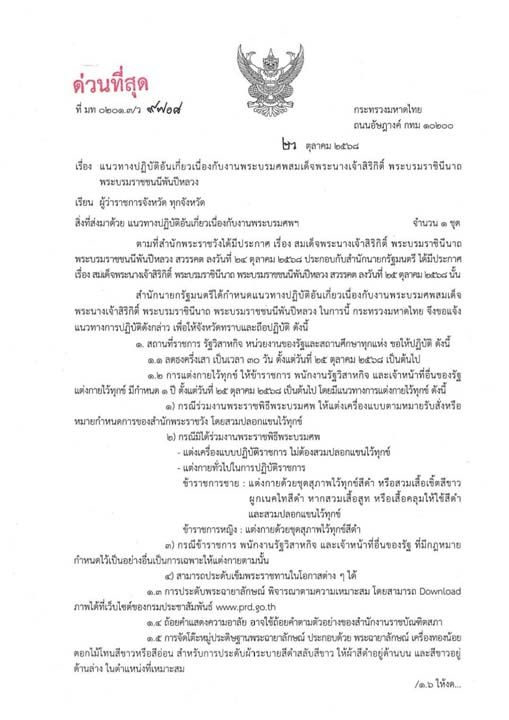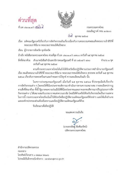 เมื่อเวลา 21.00 น.วันที่ 26 ตุลาคม 2568 นายอรรษิษฐ์ สัมพันธรัตน์ ปลัดกระทรวงมหาดไทย ได้ส่งหนังสือถึงผู้ว่าราชการจังหวัดทั่วประเทศ เกี่ยวกับการจัดกิจกรรมอันเนื่องกับงานพระบรมศพ สมเด็จพระนางเจ้าสิริกิติ์ พระบรมราชินีนาถพระบรมราชชนนีพันปีหลวง ตามมติคณะรัฐมนตรีเมื่อวันที่ 25 ตุลาคม 2568 พร้อมทั้งให้แจ้งอำเภอ และองค์กรปกครองส่วนท้องถิ่นในพื้นที่ถือปฏิบัติเช่นเดียวกับจังหวัด ซึ่งมีสาระสำคัญเน้นย้ำถึง "การไม่ได้ห้ามหรือให้ระงับกิจกรรมใดเป็นการเฉพาะ" โดยประชาชนพิจารณาดำเนินการตามความเหมาะสม ทั้งนี้ รัฐบาลขอความร่วมมือให้พี่น้องประชาชนและภาคเอกชนพิจารณาปรับรูปแบบการจัดกิจกรรมต่าง ๆ ให้เหมาะสมกับบรรยากาศแห่งความอาลัย