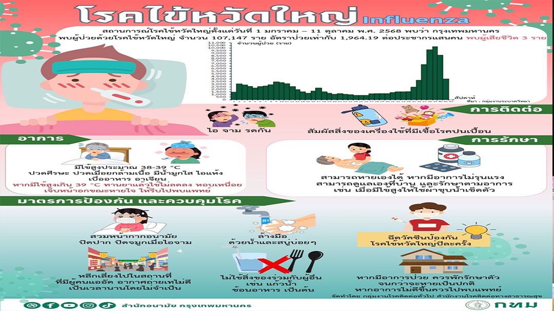 สถานการณ์โรคไข้หวัดใหญ่ในกรุงเทพมหานคร ตั้งแต่วันที่ 1 มกราคม - 11 ตุลาคม 2568 พบผู้ป่วยด้วยโรคไข้หวัดใหญ่ จำนวน 107,147 ราย อัตราป่วยเท่ากับ 1,964.19 ต่อประชากรแสนคน พบผู้เสียชีวิต 3 ราย