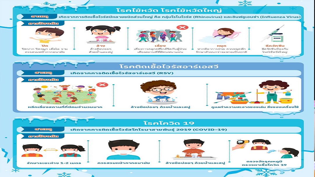 ส่วนแนวโน้มสถานการณ์ผู้ป่วยโรคติดต่อและภัยสุขภาพในช่วงฤดูหนาว โดยโรคติดต่อที่มักพบและมีแนวโน้มเพิ่มขึ้นในช่วงฤดูหนาว ได้แก่ กลุ่มโรคระบบทางเดินหายใจ เช่น ไข้หวัดใหญ่ ปอดอักเสบ โควิด-19 และกลุ่มโรคติดต่อทางเดินอาหาร เช่น โรคอุจจาระร่วงเฉียบพลันจากเชื้อไวรัส เช่น โรต้า โนโรไวรัส เป็นต้น นอกจากนี้ ยังต้องเฝ้าระวังภัยสุขภาพจากสภาพอากาศแปรปรวน เช่น ภาวะผิวหนังแห้ง หรือการเสียชีวิตจากอากาศหนาว (ภัยหนาว) โดยเฉพาะประชาชนในกลุ่มเสี่ยง กลุ่มเปราะบาง