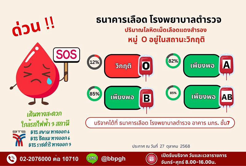 วันที่ 27 ตุลาคม 2568 เพจเฟซบุ๊ก "สำนักงานตำรวจแห่งชาติ" โพสต์ข้อความระบุว่า ด่วน!! ปริมาณโลหิตเม็ดเลือดแดงสำรองในคลังของธนาคารเลือด รพ.ตำรวจ หมู่ O อยู่ในสถานะวิกฤต ร่วมบริจาคโลหิตได้ที่ ธนาคารเลือด รพ.ตำรวจ อาคาร มภร.ชั้น 7 ในเวลาราชการ