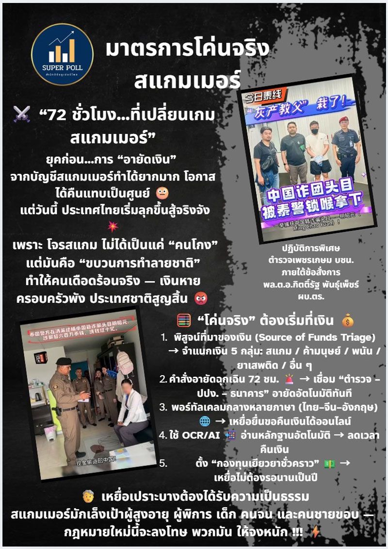 เพราะแม้ว่าวันนี้ พล.ต.อ.กิตติ์รัฐ พันธุ์เพ็ชร์ ผบ.ตร.จะมีผลงานโดดเด่นมากกว่าอดีต ทำให้เจ้าหน้าที่อายัดเงินได้ทันเป็นหลักหมื่นล้านบาท แต่ขั้นตอน “การคืนเงินให้เหยื่อ” ยังล่าช้าและไม่ทั่วถึง เพราะมีการปะปนของเงินจากฐานความผิดหลายประเภท เช่น ยาเสพติด การพนันออนไลน์ ค้ามนุษย์ และสแกมออนไลน์ แนวคิดปราบปรามสแกมเมอร์: โค่นได้จริงต้องโฟกัสที่ “เงิน” เงินทุกบาทที่อาชญากรยึดไป รัฐบาลจะเอาคืนให้ประชาชนให้มากที่สุดและเร็วที่สุด เราจะทำให้การคืนเงินเป็นเรื่อง ‘ระบบ’ ไม่ใช่ ‘โชค’ หรือ เรื่องบังเอิญ เราจะเอาผิดทั้งตัวบงการ บัญชีม้า ซิมม้า และผู้สนับสนุนทุกระดับ ด้วยยุทธการบังคับใช้กฎหมายใหม่ มาตรการเร่งด่วน โค่นสแกมเมอร์ได้จริง“ภายใน 72 ชั่วโมง”