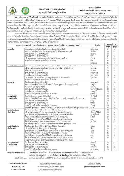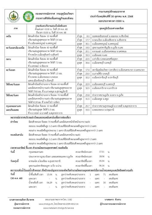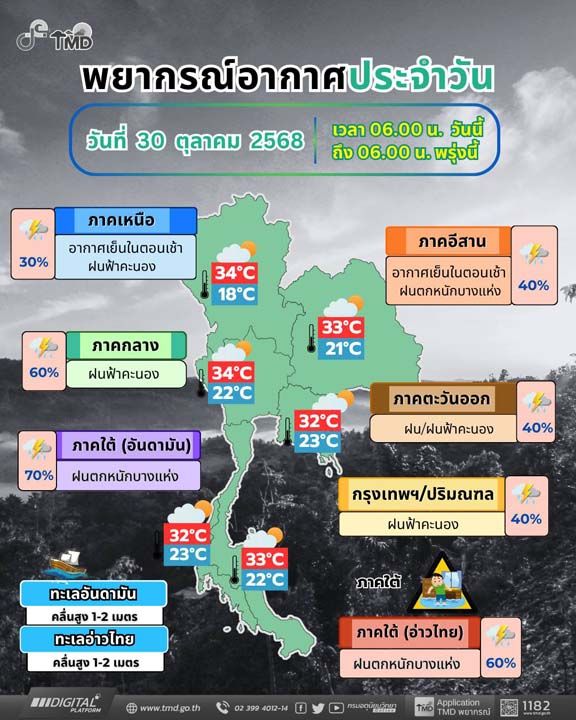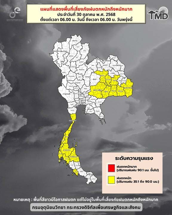 30 ตุลาคม 2568 กรมอุตุนิยมวิทยา รายงานลักษณะอากาศทั่วไป พยากรณ์อากาศ 24 ชั่วโมงข้างหน้า ประเทศไทยมีฝนเพิ่มขึ้น และมีฝนตกหนักบางแห่งในภาคตะวันออกเฉียงเหนือตอนล่างและภาคใต้ โดยเฉพาะจังหวัดร้อยเอ็ด มหาสารคาม นครราชสีมา บุรีรัมย์ สุรินทร์ ศรีสะเกษ กาญจนบุรี ประจวบคีรีขันธ์ ชุมพร สุราษฎร์ธานี ระนอง พังงา และภูเก็ต แต่ยังคงมีอากาศเย็นในตอนเช้าบริเวณภาคเหนือ และภาคตะวันออกเฉียงเหนือ เนื่องจากมีหย่อมความกดอากาศต่ำกำลังแรงปกคลุมบริเวณปลายแหลมญวน ประกอบกับมีแนวพัดสอบของลมตะวันออกและลมตะวันออกเฉียงใต้พัดปกคลุมภาคเหนือ ในขณะที่บริเวณความกดอากาศสูงหรือมวลอากาศเย็นกำลังอ่อนปกคลุมประเทศไทยตอนบน