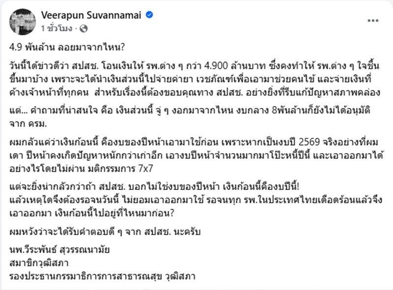 ล่าสุด นพ.วีระพันธ์ สุวรรณนามัย รองประธานกรรมาธิการการสาธารณสุข วุฒิสภา (สว.) โพสต์ข้อความผ่านเฟซบุ๊ก ระบุว่า 4.9 พันล้าน ลอยมาจากไหน?