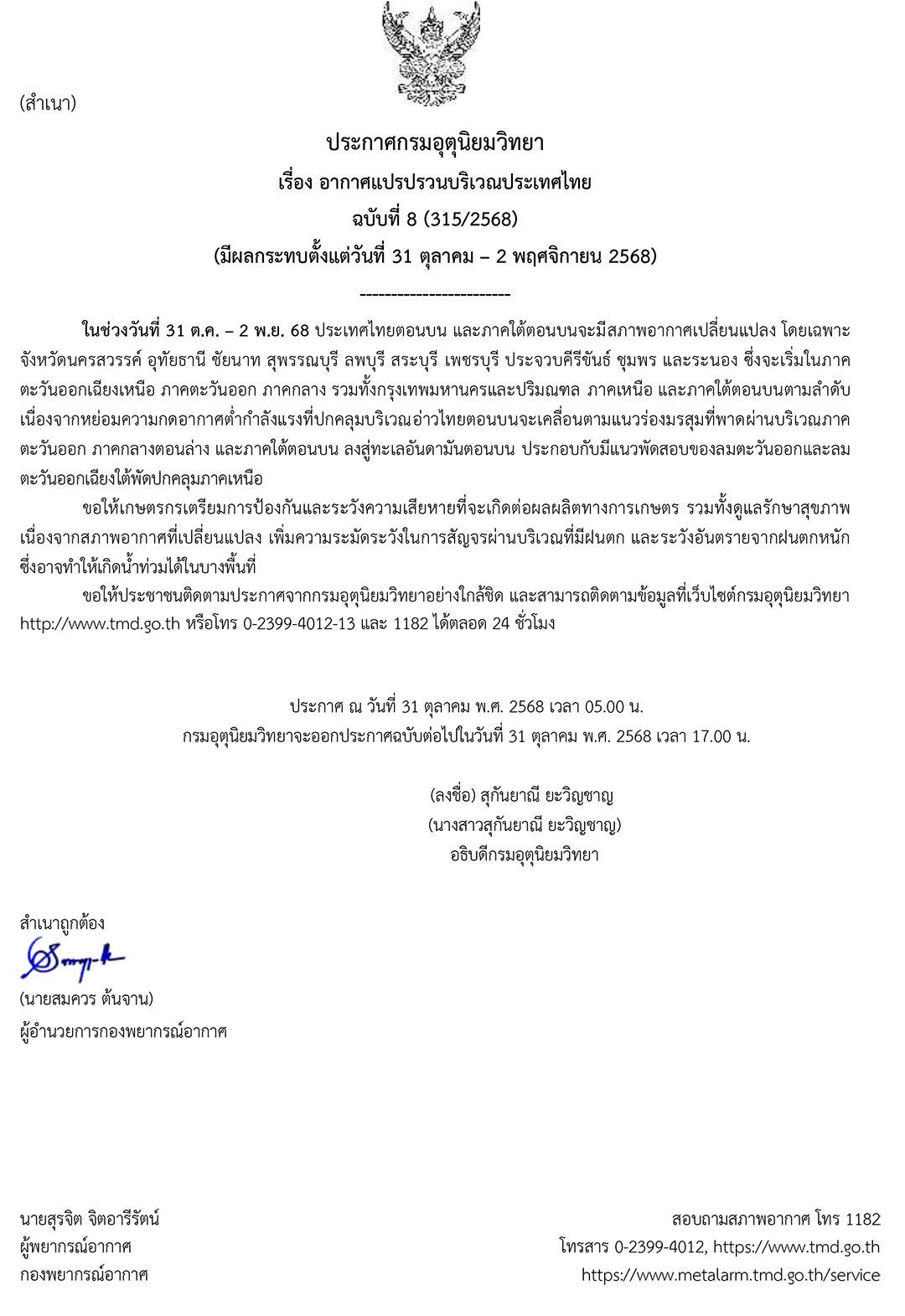 เมื่อเวลา 05.00 น.วันที่ 31 ตุลาคม 2568 กรมอุตุนิยมวิทยา ประกาศเรื่อง อากาศแปรปรวนบริเวณประเทศไทย ฉบับที่ 8 (315/2568) (มีผลกระทบตั้งแต่วันที่ 31 ตุลาคม - 2 พฤศจิกายน 2568) ระบุว่า ในช่วงวันที่ 31 ต.ค. - 2 พ.ย.68 ประเทศไทยตอนบน และภาคใต้ตอนบนจะมีสภาพอากาศเปลี่ยนแปลง โดยเฉพาะจังหวัดนครสวรรค์ อุทัยธานี ชัยนาท สุพรรณบุรี ลพบุรี สระบุรี เพชรบุรี ประจวบคีรีขันธ์ ชุมพร และระนอง ซึ่งจะเริ่มในภาคตะวันออกเฉียงเหนือ ภาคตะวันออก ภาคกลาง รวมทั้งกรุงเทพมหานครและปริมณฑล ภาคเหนือ และภาคใต้ตอนบนตามลำดับ เนื่องจากหย่อมความกดอากาศต่ำกำลังแรงที่ปกคลุมบริเวณอ่าวไทยตอนบนจะเคลื่อนตามแนวร่องมรสุมที่พาดผ่านบริเวณภาคตะวันออก ภาคกลางตอนล่าง และภาคใต้ตอนบน ลงสู่ทะเลอันดามันตอนบน ประกอบกับมีแนวพัดสอบของลมตะวันออกและลมตะวันออกเฉียงใต้พัดปกคลุมภาคเหนือ