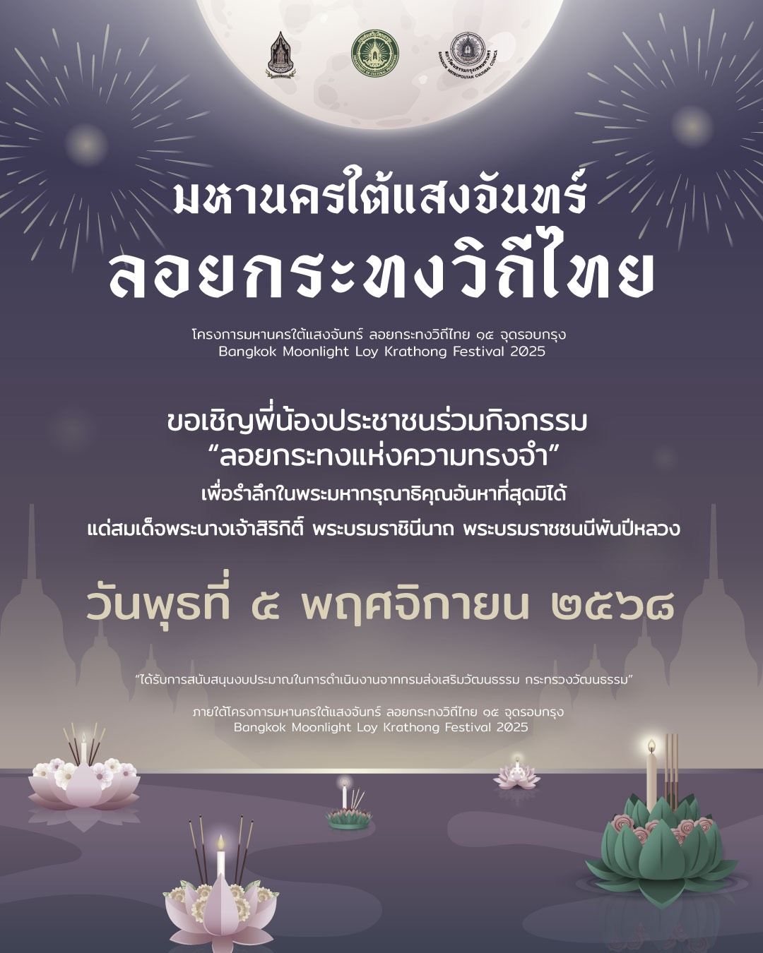 จึงขอเชิญชวนประชาชนและนักท่องเที่ยวทุกท่าน เดินทางมาร่วมเป็นส่วนหนึ่งของการสืบสานประเพณีลอยกระทงอันทรงคุณค่า ณ พื้นที่จัดงานทั้ง 15 จุด ใกล้บ้านท่าน เพื่อร่วมกันอธิษฐานจิต ขอขมาพระแม่คงคา และสัมผัสกับเสน่ห์ของ ‘มหานคร ใต้แสงจันทร์’ ในคืนวันเพ็ญอย่างพร้อมเพรียง