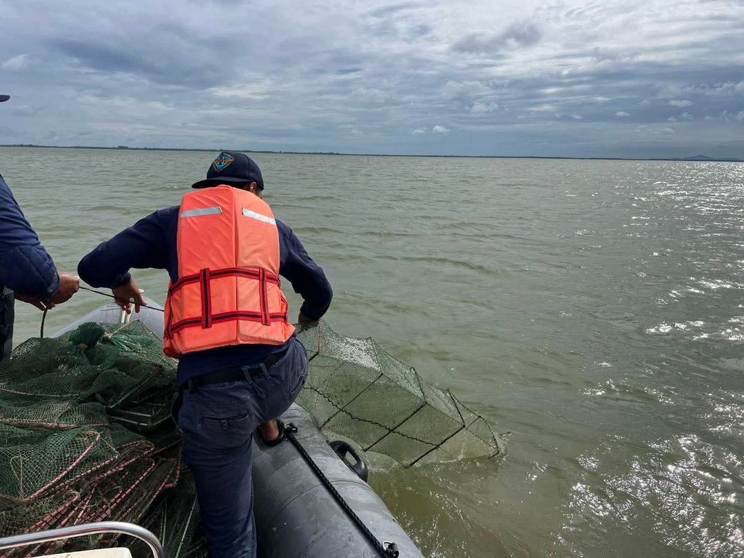 เมื่อเจ้าหน้าที่มาถึงบริเวณอ่าวปัตตานี ตำบลบานา อำเภอเมืองปัตตานี ห่างจากชายฝั่งประมาณ 0.5 ไมล์ทะเล ได้ดำเนินการตรวจยึดเครื่องมือลอบพับได้ หรือ ‘ไอ้โง่’ กลางอ่าวปัตตานี จำนวน 45 ลูก