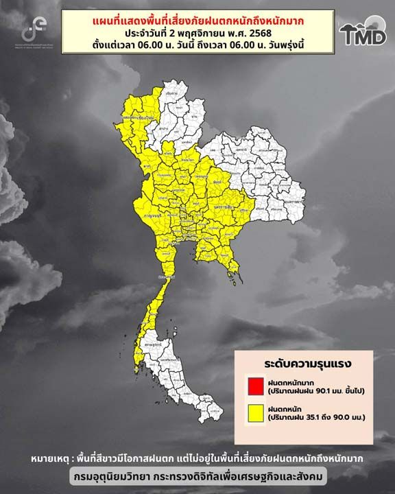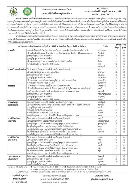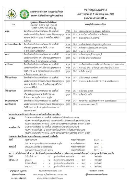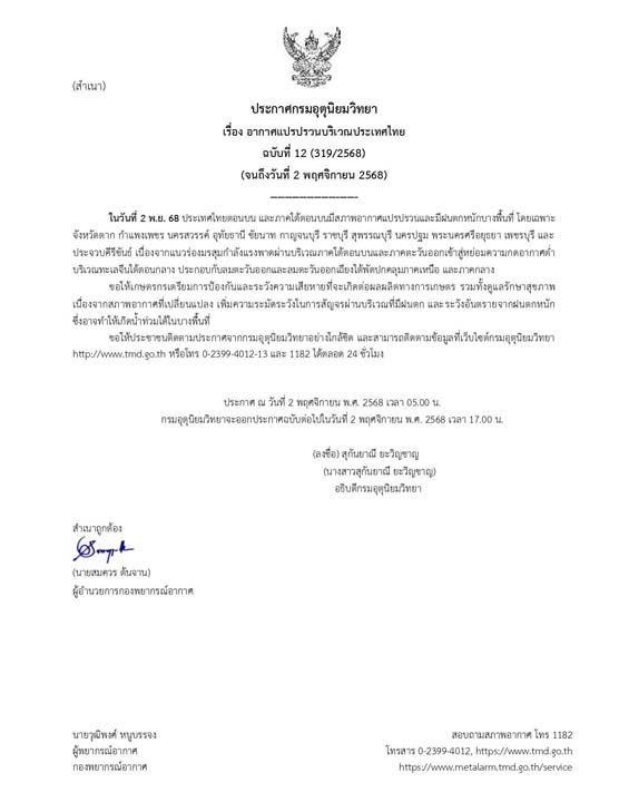 2 พฤศจิกายน 2568 กรมอุตุนิยมวิทยา ออกประกาศเรื่อง “อากาศแปรปรวนบริเวณประเทศไทย ฉบับที่ 12 (จนถึงวันที่ 2 พฤศจิกายน 2568)