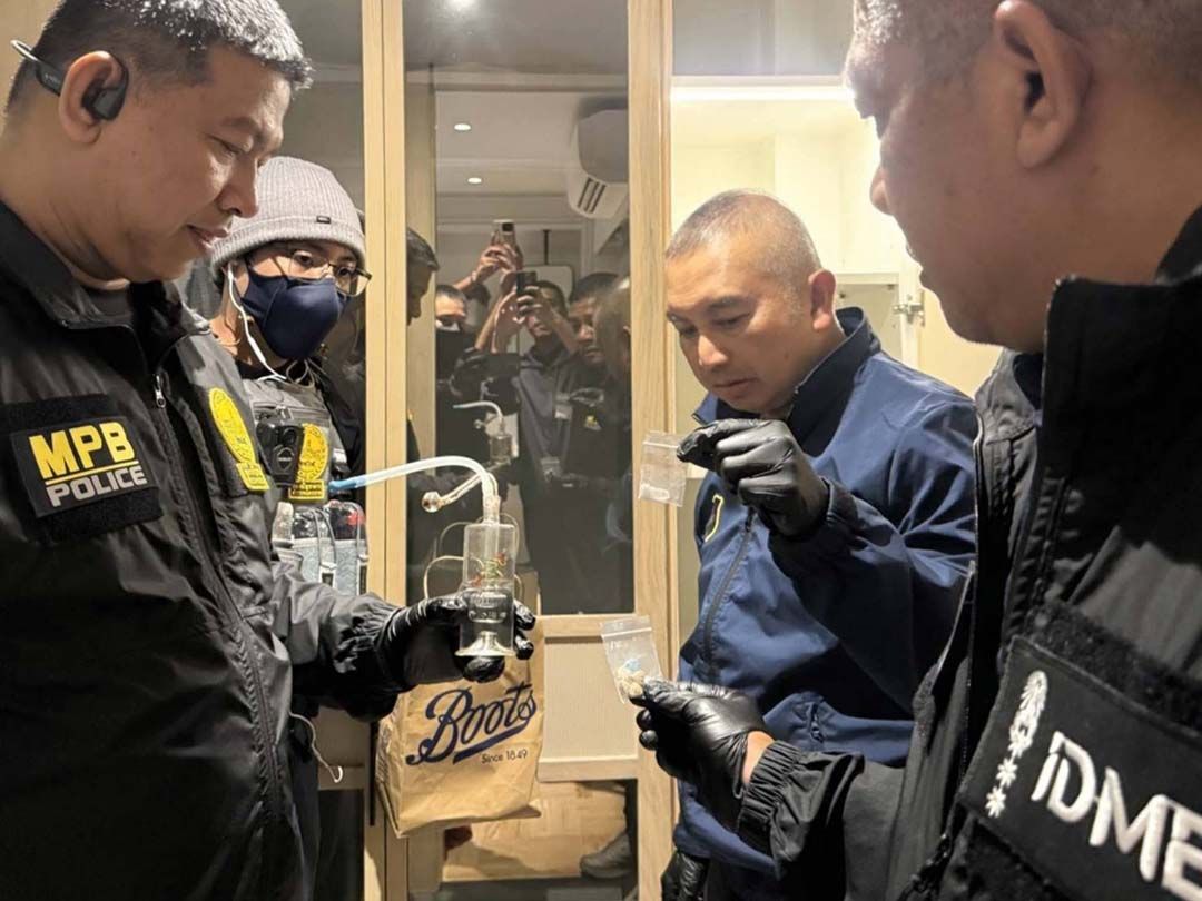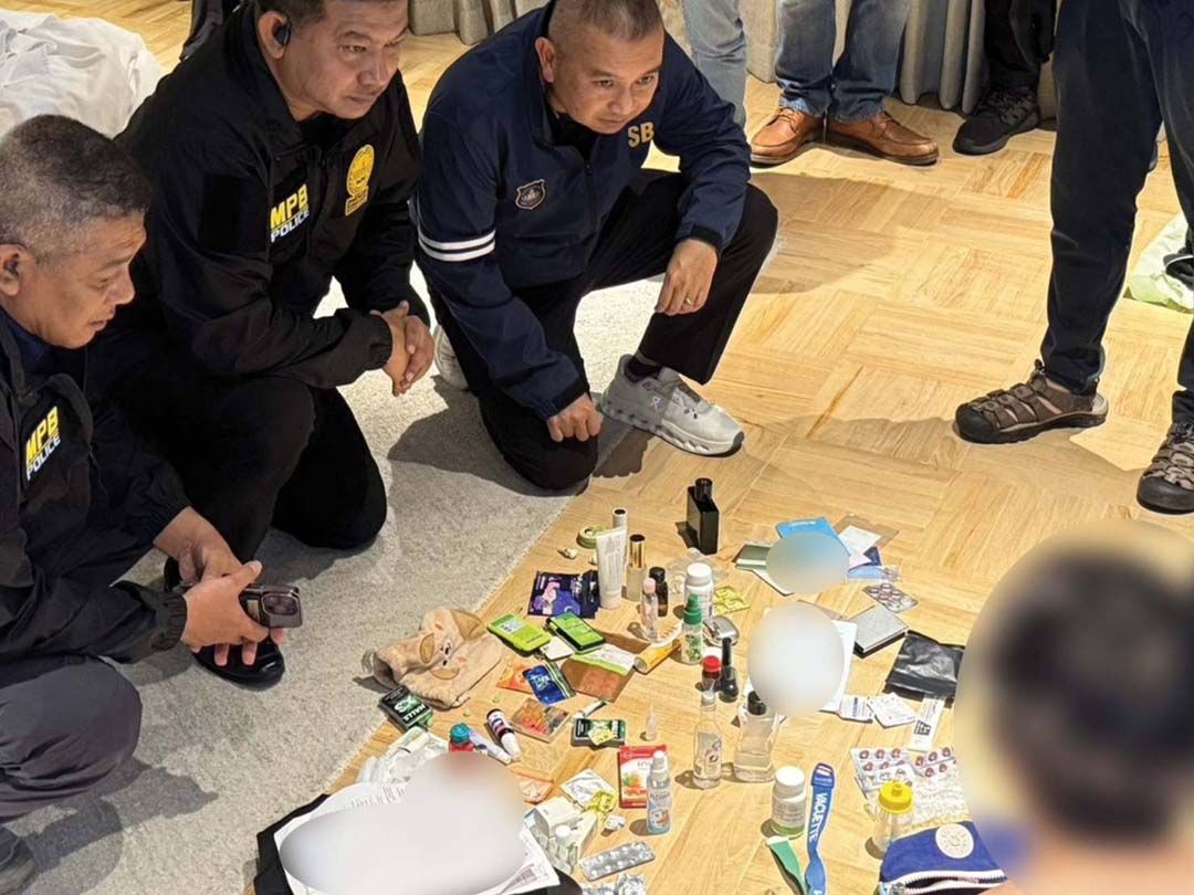 ตรวจยึดของกลาง 1.ยาไอซ์ 1.11 กรัม 2.ยาบ้า 2 เม็ด 3.ยาอีน้ำ 1 ขวด 4.เคตามีน 0.75 กรัม 5.ยาไวอากร้า 2 กล่อง 6.ยาป๊อปเปอร์ (สารระเหย ใช้ลดความปวดทวารหนัก) จำนวน 30 ขวด 7.เข็มฉีดยา 10 เข็ม 8.อุปกรณ์การเสพยาเสพติด 9.ถุงยางอนามัย 10.เจลหล่อลื่น จับกุมได้ที่ห้องสูทในโรงแรมหรูชื่อดัง ในซอยสุขุมวิท 13 แขวงวัฒนา เขตคลองตันเหนือ กรุงเทพฯ