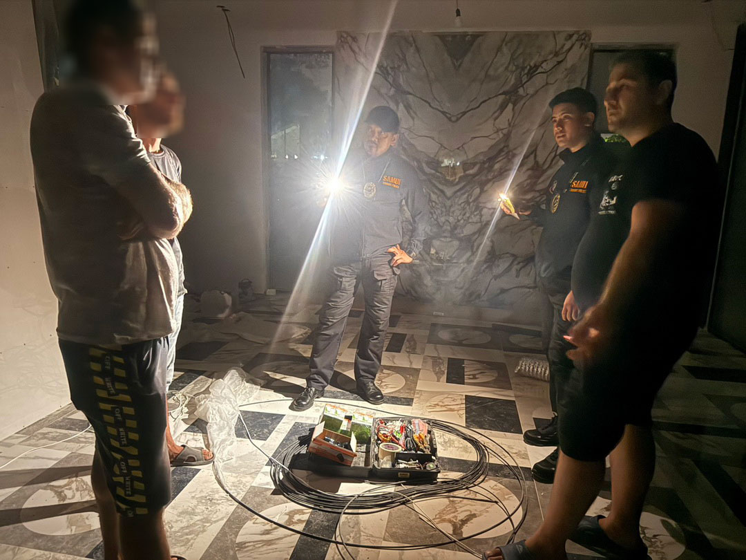 เจ้าหน้าที่ตำรวจท่องเที่ยวได้ติดตามพฤติกรรมของบริษัทฯ และเข้าตรวจสอบบริเวณบ้านศรีธนู หมู่ 8 ต.เกาะพะงัน อ.เกาะพะงัน พบชาวต่างชาติ 2 ราย กำลังติดตั้งหลอดไฟฟ้าและเดินสายไฟอยู่ภายในหมู่บ้านที่กำลังก่อสร้าง จึงเข้าแสดงตัวเข้าจับกุม โดยได้จับกุม นายอัฟลาน อายุ 33 ปี สัญชาติอาเซอร์ไบจาน และนายซาร์กฮาน อายุ 33 ปี สัญชาติอาเซอร์ไบจาน