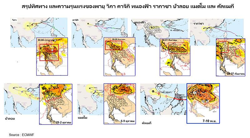 พื้นที่หลายจังหวัดในประเทศไทยบริเวณเฉดสีเหลือง และส้มในกรอบสีแดงจะได้รับผลกระทบรุนแรงจากฝนตกหนัก ทำให้มีความเสี่ยงสูงต่อการเกิดน้ำท่วม น้ำล้นตลิ่ง น้ำไหลหลาก น้ำท่วมรอการระบายจึงต้องติดตาม และเฝ้าระวังขั้นสูงสุด โดยตั้งแต่เช้าวันที่ 7 พฤศจิกายนในพื้นที่ภาคตะวันออกเฉียงเหนือตอนกลาง และตอนล่าง (โดยเฉพาะ จ.อุบลฯ ศรีสะเกษ สุรินทร์ บุรีรัมย์ อำนาจเจริญ ยโสธร ร้อยเอ็ด มหาสารคาม กาฬสินธุ์ และมุกดาหาร) และเข้าสู่ภาคเหนือตั้งแต่วันที่ 8 พฤศจิกายน (จ.น่าน แพร่ อุตรดิตถ์) และภาคกลางหลายจังหวัดจนถึงวันที่ 10 พฤศจิกายน จึงขอให้จังหวัดในพื้นที่เสี่ยงตั้ง War room เฝ้าระวัง ติดตาม ประสานงานกับศูนย์เตือนภัยพิบัติแห่งชาติอย่างใกล้ชิด เพื่อแจ้งเตือนพี่น้องประชาชนอย่างทันเหตุการณ์