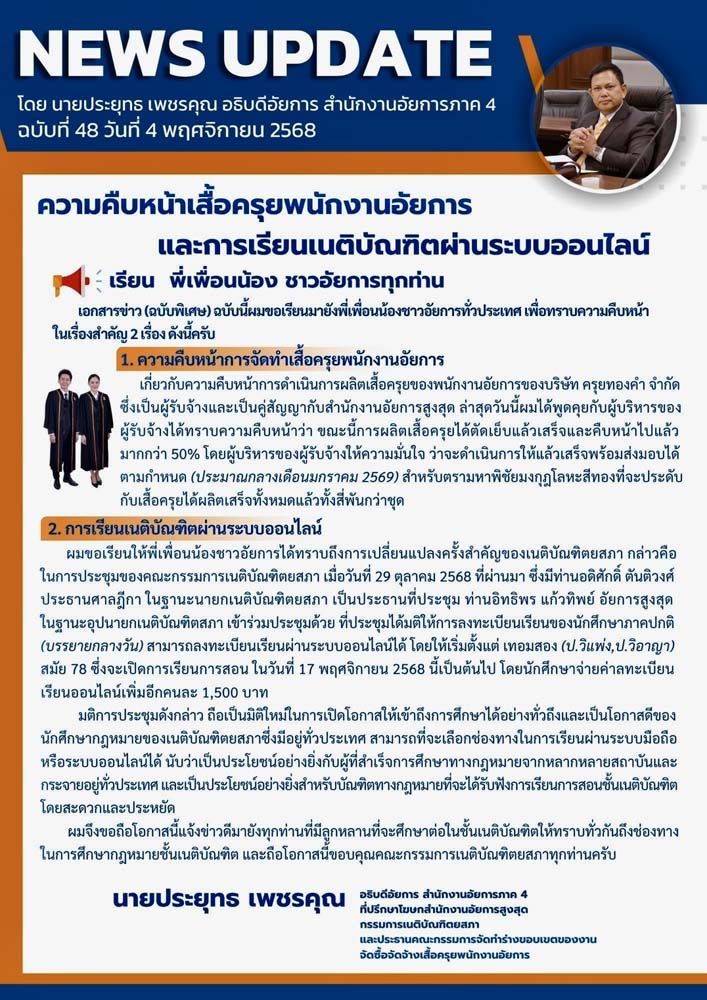 2. การเรียนเนติบัณฑิตผ่านระบบออนไลน์ขอเรียนให้พี่เพื่อนน้องชาวอัยการได้ทราบถึงการเปลี่ยนแปลงครั้งสำคัญของเนติบัณฑิตยสภา กล่าวคือในการประชุมของคณะกรรมการเนติบัณฑิตยสภา เมื่อวันที่ 29 ตุลาคม2568 ที่ผ่านมา ซึ่งมีท่านอดิศักดิ์ ตันติวงศ์ ประธานศาลฎีกา ในฐานะนายกเนติบัณฑิตยสภา เป็นประธานที่ประชุม ท่านอิทธิพร แก้วทิพย์ อัยการสูงสุดในฐานะอุปนายกเนติบัณฑิตสภา เข้าร่วมประชุมด้วย ที่ประชุมได้มติให้การลงทะเบียนเรียนของนักศึกศึกษาภาคปกติ (บรรยายกลางวัน) สามารถลงทะเบียนเรียนผ่านระบบออนไลน์ได้ โดยให้เริ่มตั้งแต่ เทอมสอง (ป.วิแพ่ง,ป.วิอาญา) สมัย 78 ซึ่งจะเปิดการเรียนการสอน ในวันที่ 17 พฤศจิกายน นี้เป็นต้นไป โดยนักศึกษาจ่ายค่าลงทะเบียนเรียนออนไลน์เพิ่มอีกคนละ 1,500 บาท มติการประชุมดังกล่าว ถือเป็นมิติใหม่ในการเปิดโอกาสให้เข้าถึงการศึกษาได้อย่างทั่วถึงและเป็นโอกาสดีของนักศึกษากฎหมายของเนติบัณฑิตยสภาซึ่งมีอยู่ทั่วประเทศ สามารถที่จะเลือกช่องทางในการเรียนผ่านระบบมือถือ หรือระบบออนไลน์ได้ นับว่าเป็นประโยชน์อย่างยิ่งกับผู้ที่สำเร็จการศึกษาทางกฎหมายจากหลากหลายสถาบันและ กระจายอยู่ทั่วประเทศ และเป็นประโยชน์อย่างยิ่งสำหรับบัณฑิตทางกฎหมายที่จะได้รับฟังการเรียนการสอนชั้นเนติบัณฑิต