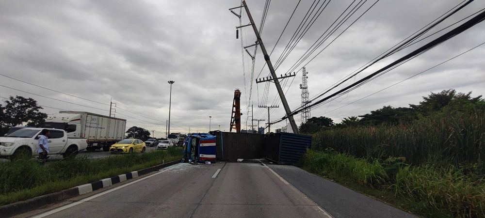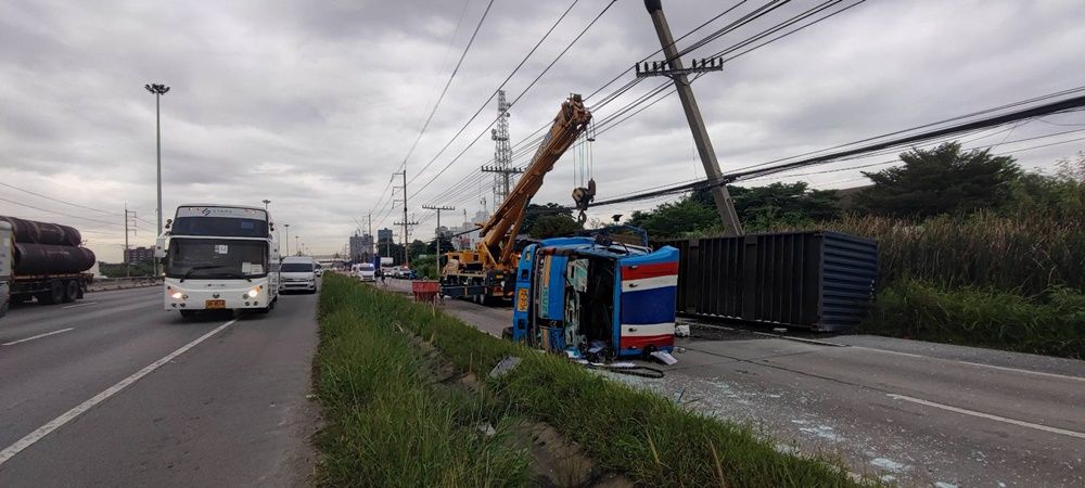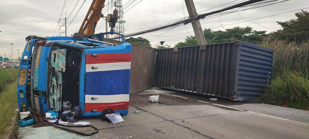 ที่เกิดเหตุพบรถเทรลเลอร์บรรทุกตู้คอนเทนเนอร์พลิกคว่ำกีดขวางการจราจรอยู่ช่องเลนคู่ขนานโดยรถไม่สามารถที่สัญจรผ่านไปได้และชนเสาไฟเพียง 1 ต้น เป็นรถเทรลเลอร์ยี่ห้อ isuzu ทะเบียน สระบุรี โดยมีนายชรัณ (ขอสงวนนามสกุล) อายุ 51 ปีเป็นคนขับรถได้รับบาดเจ็บเล็กน้อย