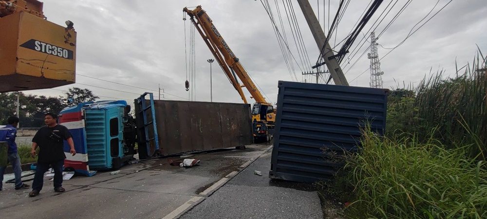 วันที่ 6 พ.ย.68 ร.ต.อ.กันตพัฒน์ ปัสสา รองสารวัตรจราจร สภ.คลองหลวง ได้รับแจ้งมีอุบัติเหตุรถเทรลเลอร์บรรทุกตู้คอนเทนเนอร์เสียหลักพลิกคว่ำกีดขวางการจราจรบริเวณถนนพหลโยธินขาออกช่องทางคู่ขนาน กม. 42 ตรงข้ามตลาดไท ตำบลคลองหนึ่ง อำเภอคลองหลวง จังหวัดปทุมธานี จึงไปที่เกิดเหตุพร้อมด้วยเจ้าหน้าที่ตำรวจจราจรสภ.คลองหลวง และรถกู้ชีพเทศบาลเมืองท่าโขลง
