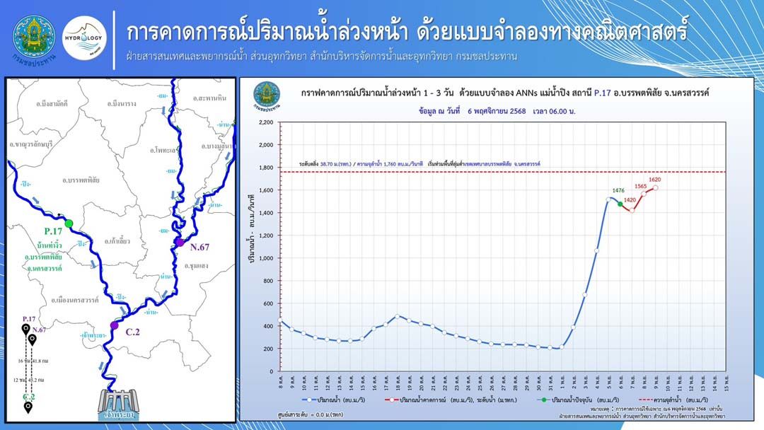 6 พฤศจิกายน 2568 กรมชลประทาน แจ้งว่า เนื่องจากในช่วงวันที่ 2-4 พฤศจิกายน 2568 มีฝนตกหนักต่อเนื่องในพื้นที่ลุ่มน้ำปิงตอนบน บริเวณจังหวัดเชียงใหม่ ลำพูน ตาก และกำแพงเพชร ทำให้มีปริมาณน้ำไหลลงสู่แม่น้ำปิงและลำน้ำสาขามากกว่าปกติ เพื่อเป็นการชะลอน้ำจากพื้นที่ตอนบนไม่ให้ไหลลงสู่ลุ่มเจ้าพระยาตอนล่างได้รวดเร็วจนเกินไป กรมชลประทานได้ใช้อ่างเก็บน้ำในพื้นที่ตอนบนช่วยกักเก็บน้ำให้มากที่สุด โดยเฉพาะเขื่อนภูมิพล จังหวัดตาก (แม่น้ำปิง) และเขื่อนสิริกิติ์ จังหวัดอุตรดิตถ์ (แม่น้ำน่าน) โดยปริมาณน้ำส่วนหนึ่งจากแม่น้ำปิงตอนบนจะถูกกักเก็บไว้ในเขื่อนภูมิพล ซึ่งช่วยหน่วงน้ำจากพื้นที่ตอนบนได้อย่างมีประสิทธิภาพ แต่ยังคงมีปริมาณน้ำอีกส่วนหนึ่ง ฝนที่ตกหนักท้ายเขื่อนภูมิพล ทำให้แม่น้ำปิงมีปริมาณน้ำเพิ่มสูงขึ้น และไหลมาสมทบกับน้ำในแม่น้ำปิงตอนล่าง จะไหลไปรวมกับน้ำที่มาจากแม่น้ำน่าน และแม่น้ำสะแกกรัง บริเวณเหนือเขื่อนเจ้าพระยา จังหวัดชัยนาท ประกอบกับมีฝนตกหนักในพื้นที่ภาคกลาง จึงส่งผลให้ระดับน้ำเหนือเขื่อนเจ้าพระยา ปรับสูงขึ้นอย่างต่อเนื่อง ปัจจุบันมีปริมาณน้ำไหลผ่านเขื่อนประมาณ 2,700 ลูกบาศก์เมตรต่อวินาที