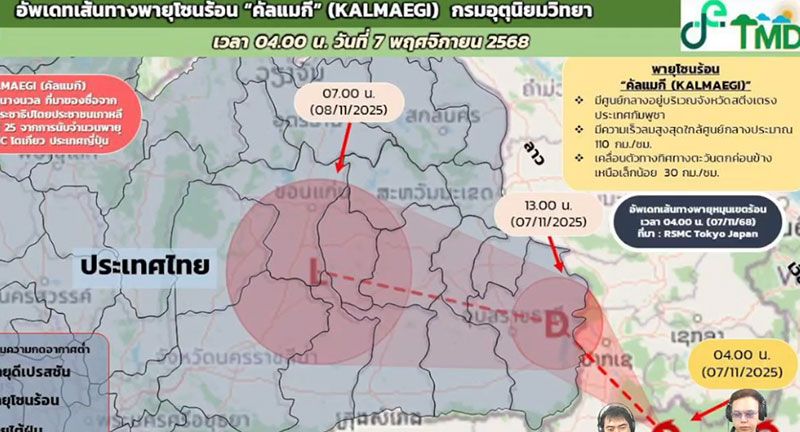 ทั้งนี้ เมื่อเวลา 06.00 น. กรมอุตุนิยมวิทยา ประกาศกรมอุตุนิยมวิทยา เรื่อง พายุ “คัลแมกี” และฝนตกหนักถึงหนักมากบริเวณประเทศไทย ฉบับที่ 12 (332/2568) ความว่า เมื่อเวลา 04.00 น. ของวันนี้ (7 พ.ย. 68) พายุคัลแมกี (KALMAEGI) บริเวณเมืองสตึงเตรง ประเทศกัมพูชาได้อ่อนกำลังลงเป็นพายุโซนร้อนแล้ว