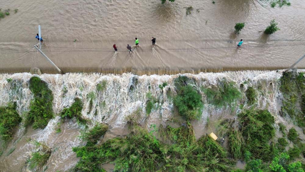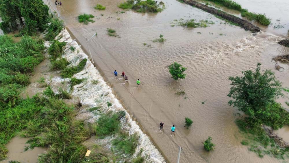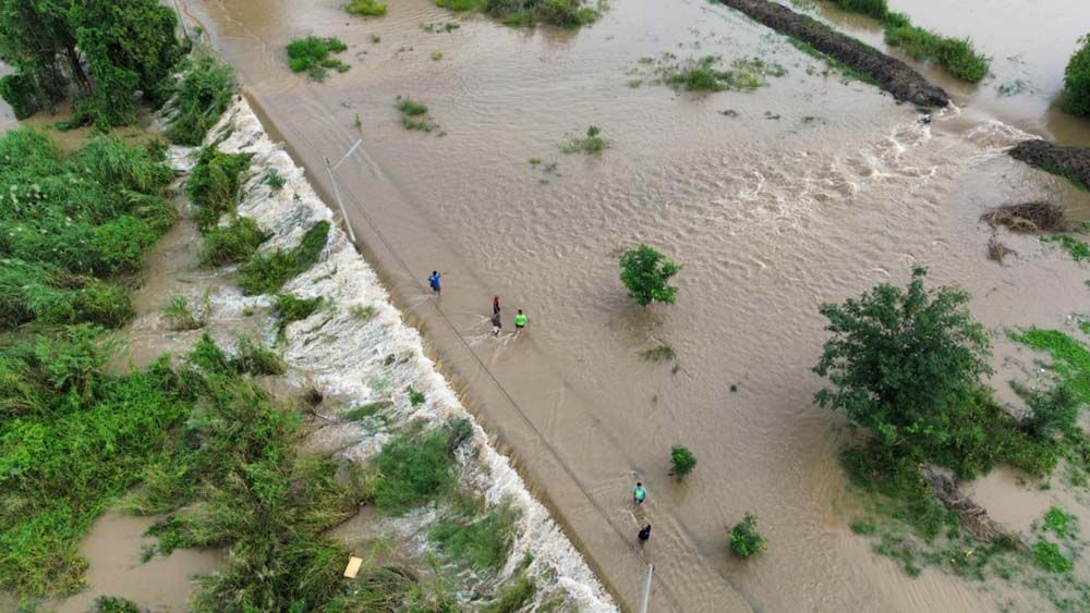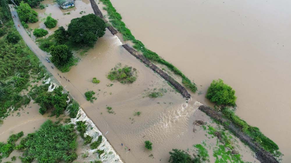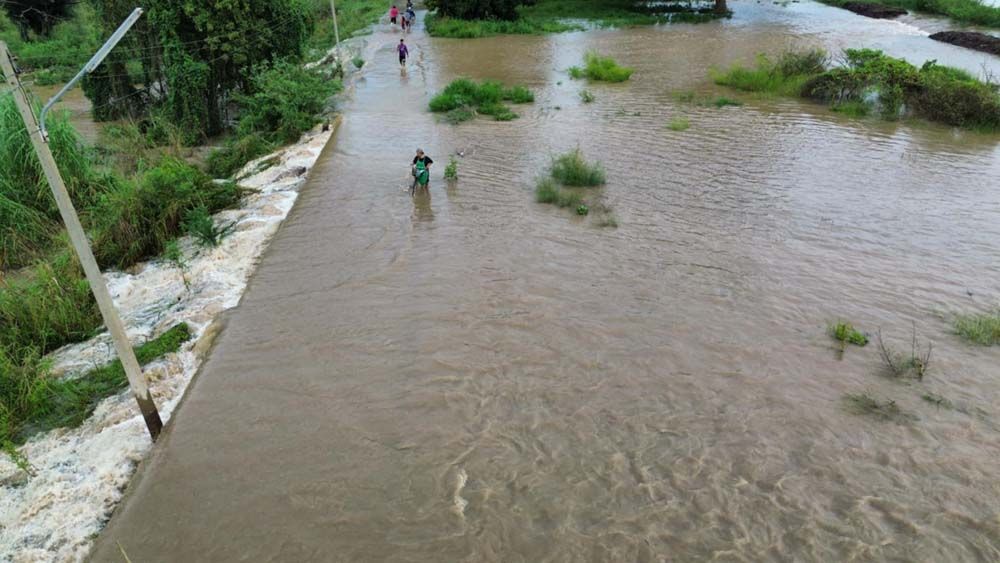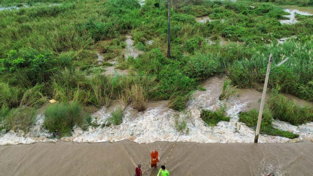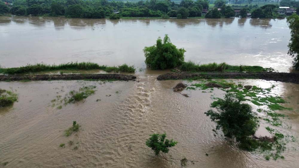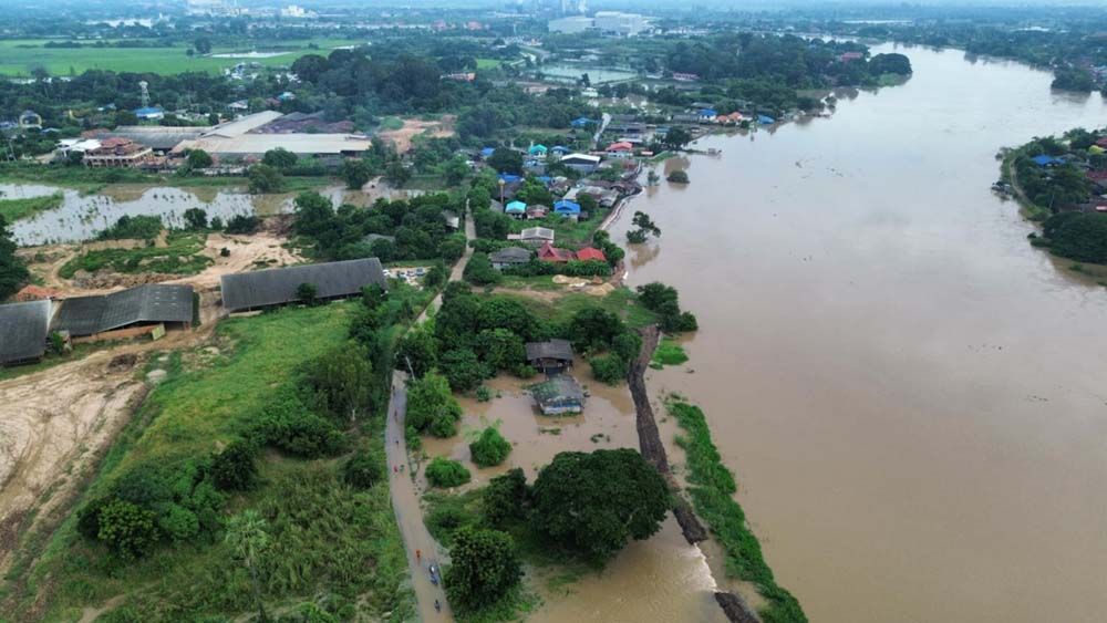 ภาพมุมสูง อ่างทอง-ชาวบ้านหมู่1ตำบลป่าโมกอ่วม น้ำไหลทะลักเข้าหมู่บ้านกลางดึก หลังคันดินกั้นน้ำเจ้าพระยาแตก เบื้องต้นได้รับผลกระทบร่วม100 หลังคาเรือน และกำลังขยายวงกว้าง ชาวบ้านอพยบสัตว์เลียงไว้ที่ปลอดภัย ด้าน นางสาวฝน ขนของหนี แต่ยังไม่รู้ว่าจะไปพักตรงไหน