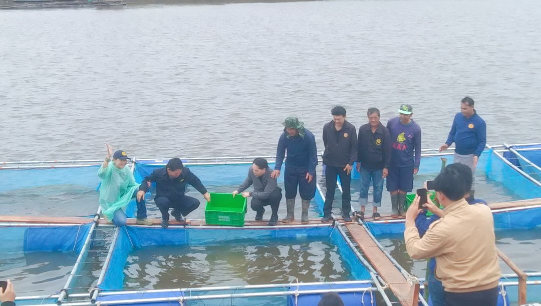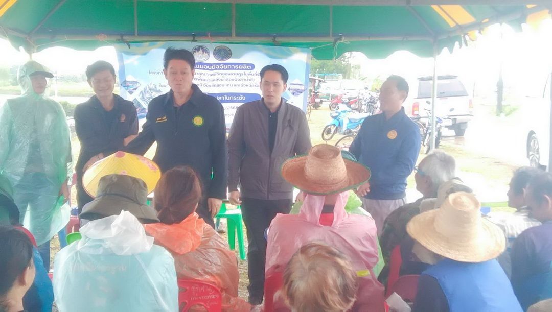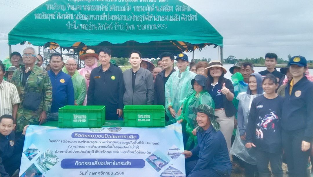 โดยสำนักงานประมงจังหวัดร้อยเอ็ด มอบปัจจัยการผลิต กระชัง จำนวน 20 กระชัง ปลาดุก จำนวน 20,000 ตัว ปลานิล จำนวน 2,000 ตัว อาหารปลาดุก จำนวน 120 กระสอบ อาหารปลานิล จำนวน 120 กระสอบ