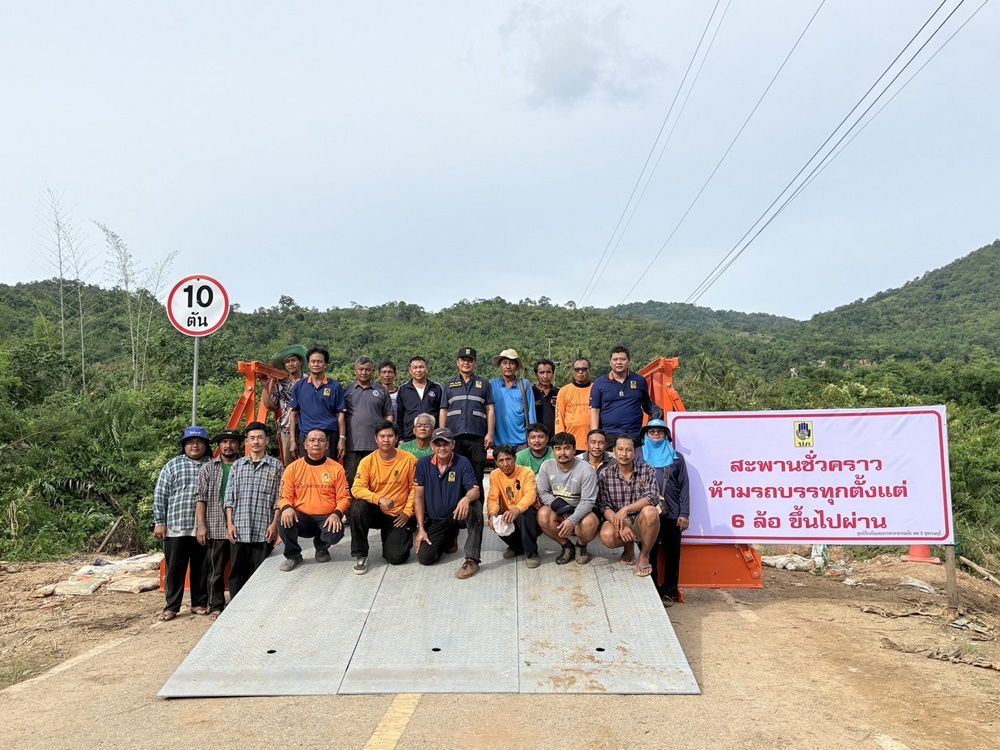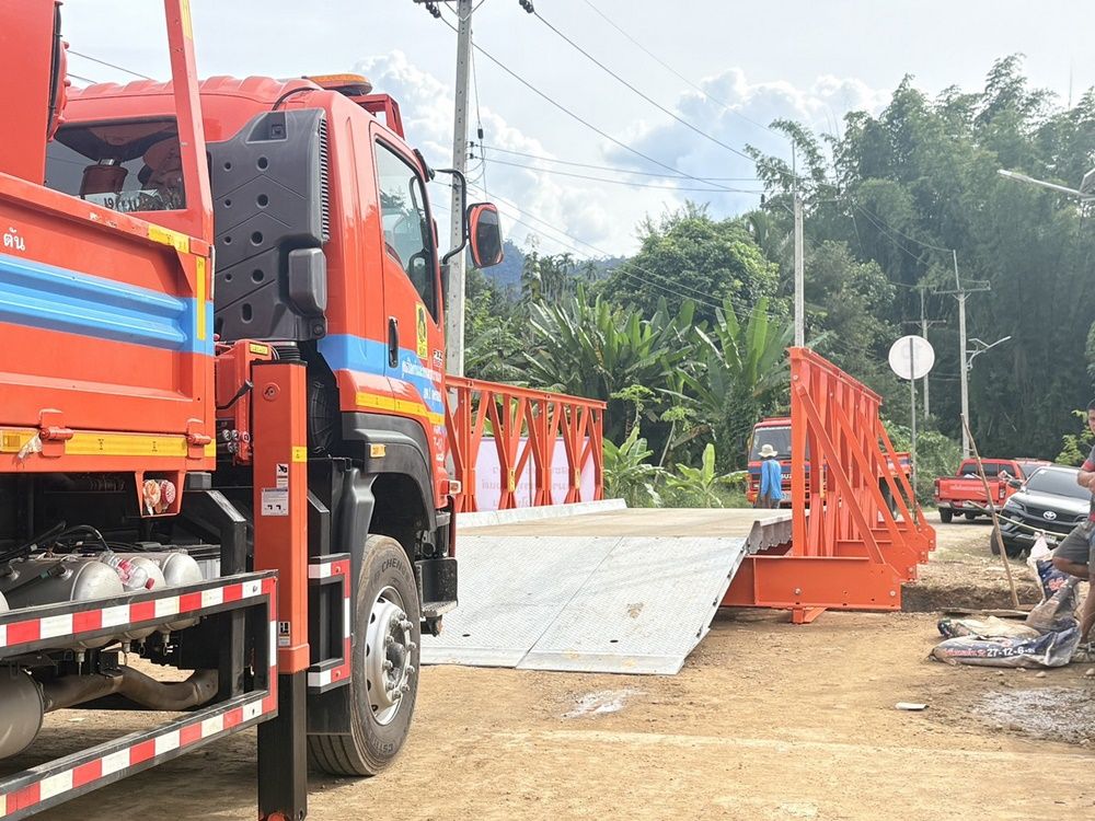 ปภ.เขต 2 สุพรรณบุรี-ทต.เขาโจดและชาวบ้านร่วมแรงติดตั้งสะพานแบริ่งเสร็จแล้ว หลังคอสะพานถูกกระแสน้ำกัดเซาะขาดจากพายุถล่ม ห้ามรถบรรทุก 6 ล้อขึ้นไปข้ามสะพานเด็ดขาด