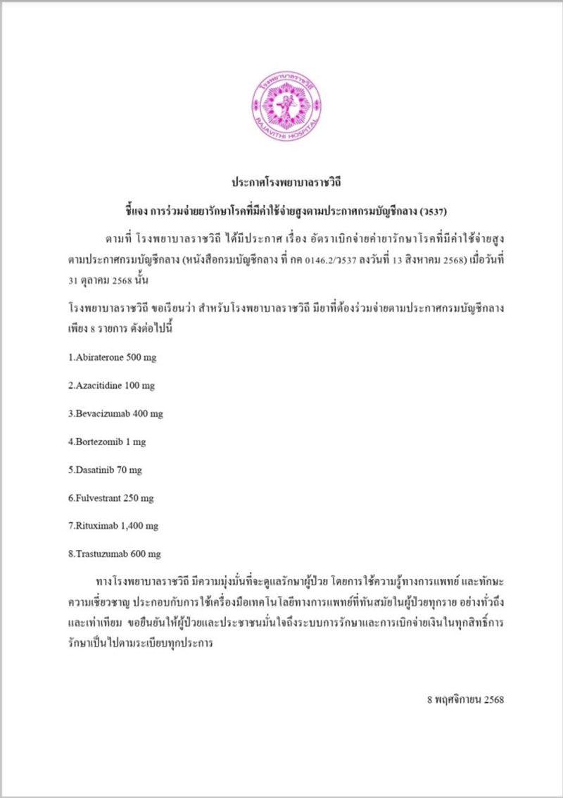 ตามที่ โรงพยาบาลราชวิถี ได้มีประกาศ เรื่อง อัตราเบิกจ่ายค่ายารักษาโรคที่มีค่าใช้จ่ายสูง ตามประกาศกรมบัญชีกลาง (หนังสือกรมบัญชีกลาง ที่ กค 0146.2/ว537 ลงวันที่ 13 สิงหาคม 2568) เมื่อวันที่ 31 ตุลาคม 2568 นั้น