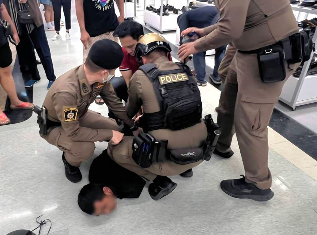 หลังจากนั้นคนร้ายได้วิ่งหนีออกไปทางหน้าห้าง เจอเข้ากับตำรวจชุดสืบนอกเครื่องแบบ จ่าเปิ้ล กระทุ่มแบน จ.ส.ต.สุกิจ กล้าสงคราม ที่บังเอิญพาลูกมากินข้าวที่ห้าง พอรู้ว่ามีคนร้ายปล้นร้านทอง จึงวิ่งอ้อมมาดักทางออกไว้เผชิญหน้ากับคนร้าย เมื่อคนร้ายเห็นตำรวจได้พยายามใช้ปืนยิงขี้นฟ้าเพื่อเปิดทาง แต่ปืนยิงไม่ได้เนื่องจากตอนที่หยิบทองออกจากร้านแม็กที่ใส่กระสุนปืนได้หลุดหล่นออกจากปืนตกอยู่ที่หน้าร้านทอง ทางจ่าเปิ้ลจึงได่พุ่งเข้าชาร์จตัวคนร้ายพร้อมกับมีพลเมืองดีช่วยกันจับกุมตัวคนร้าย