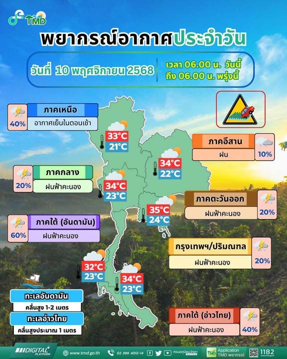 10 พฤศจิกายน 2568 กรมอุตุนิยมวิทยา รายงานลักษณะอากาศทั่วไป พยากรณ์อากาศ 24 ชั่วโมงข้างหน้า ประเทศไทยตอนบนมีฝนลดลง แต่ยังคงมีฝนฟ้าคะนองบางแห่ง เนื่องจากหย่อมความกดอากาศต่ำปกคลุมด้านตะวันตกของภาคเหนือและประเทศเมียนมา ขอให้ประชาชนในบริเวณดังกล่าวระวังอันตรายจากฝนฟ้าคะนอง ส่วนเกษตรกรควรป้องกันและระวังความเสียหายที่จะเกิดต่อผลผลิตทางการเกษตร