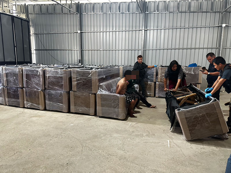 โดยพบว่าเป็นกลุ่มเครือข่าย นายกฤชร์ณชัย หรือ “เท” อายุ 40 ปี ซึ่งเป็นผู้สั่งการปัจจุบัน อยู่ระหว่างการรวบรวมพยานหลักฐาน เพื่อออกหมายจับเพิ่มเติม ซึ่งก่อนการขยายผลการจับกุมเจ้าหน้าที่ได้เฝ้าสังเกตพฤติกรรมของกลุ่มผู้ต้องหาในช่วงวันที่ 9 – 10 พฤศจิกายน จนพบว่ามีการขนย้ายของเข้าออกโกดังผิดปกติ ก่อนเข้าปฏิบัติการปิดล้อม ตรวจค้น จนพบยาบ้าซุกซ่อนอยู่ภายในโซฟาจำนวน 34 ตัว ตัวละ 1–3 กระสอบจึงควบคุมตัวผู้ต้องหาพร้อมของกลางดำเนินคดีตามกฎหมาย