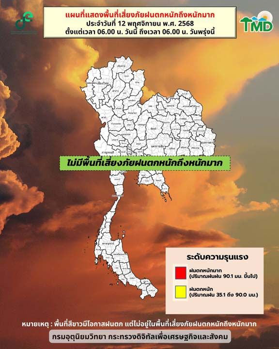 อนึ่ง พายุโซนร้อนกำลังแรง “ฟงวอง”(FUNG-WONG) บริเวณทะเลจีนใต้ตอนบน มีแนวโน้มจะเคลื่อนขึ้นไปทางทิศตะวันออกเฉียงเหนือ เข้าใกล้บริเวณเกาะไต้หวัน ในช่วงวันที่ 12-13 พ.ย. 68 โดยพายุนี้ไม่เคลื่อนเข้าสู่ประเทศไทย ขอให้ผู้ที่จะเดินทางไปบริเวณดังกล่าวตรวจสอบสภาพอากาศก่อนออกเดินทางในช่วงวันดังกล่าวไว้ด้วย