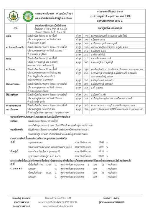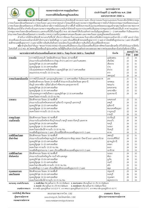 12 พฤศจิกายน 2568 กรมอุตุนิยมวิทยา รายงานลักษณะอากาศทั่วไป พยากรณ์อากาศ 24 ชั่วโมงข้างหน้า ประเทศไทยตอนบนยังคงมีฝนฟ้าคะนองบางแห่ง เนื่องจากลมตะวันออกและลมตะวันออกเฉียงใต้พัดปกคลุม ภาคตะวันออกเฉียงเหนือตอนล่าง ภาคตะวันออก และภาคกลางตอนล่าง ในขณะที่บริเวณความกดอากาศสูงหรือมวลอากาศเย็นกำลังอ่อนปกคลุมภาคเหนือตอนบนและภาคตะวันออกเฉียงเหนือตอนบน ทำให้บริเวณดังกล่าวมีอากาศเย็นในตอนเช้าบางพื้นที่ ขอให้ประชาชนบริเวณประเทศไทยตอนบนดูแลรักษาสุขภาพเนื่องจากสภาพอากาศที่เปลี่ยนแปลงไว้ด้วย