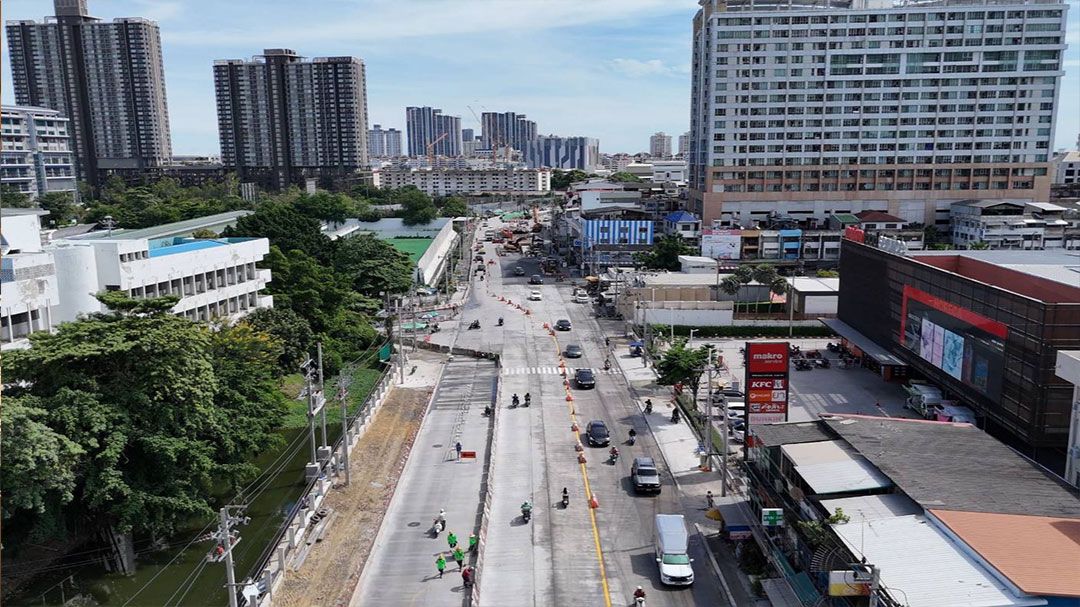 ทั้งนี้ ปัจจุบันโครงการก่อสร้างมีความคืบหน้าร้อยละ 82 โดยงานผิวจราจรคอนกรีตเสริมเหล็ก (คสล.) แล้วเสร็จประมาณ 1,600 เมตร คงเหลืออีก 200 เมตรในบริเวณที่ติดอุปสรรคท่อประธานประปา ซึ่งขณะนี้อยู่ระหว่างการวางท่อระบายน้ำ Box Culvert และก่อสร้างผิวจราจร 2 ช่องจราจร สนย. ได้กำชับผู้รับจ้างเร่งรัดก่อสร้างผิวจราจรให้แล้วเสร็จภายในเดือน พ.ย. 68 เพื่อลดผลกระทบด้านการจราจร ส่วนงานส่วนประกอบที่เหลือ ได้แก่ งานทางเท้า ระบบไฟฟ้าส่องสว่าง งานจราจรสงเคราะห์ และงานก่อสร้างรั้วชดเชยบริเวณมหาวิทยาลัยรามคำแหงและ กกท. อยู่ระหว่างเร่งดำเนินการ คาดว่าจะแล้วเสร็จทั้งหมดภายในต้นปี 2569