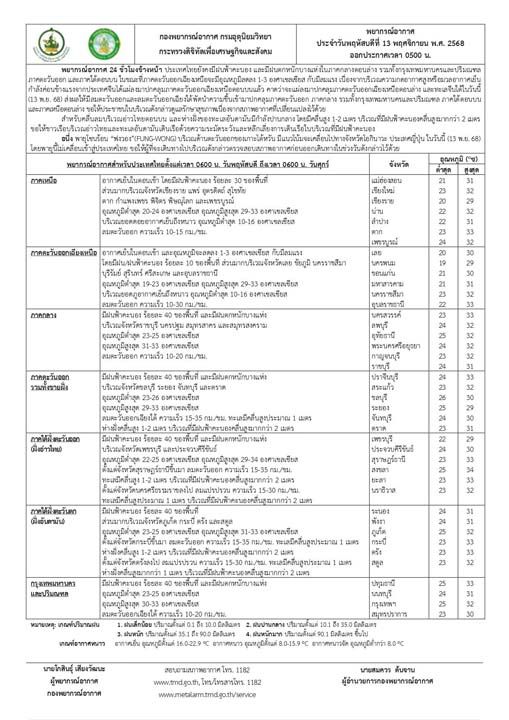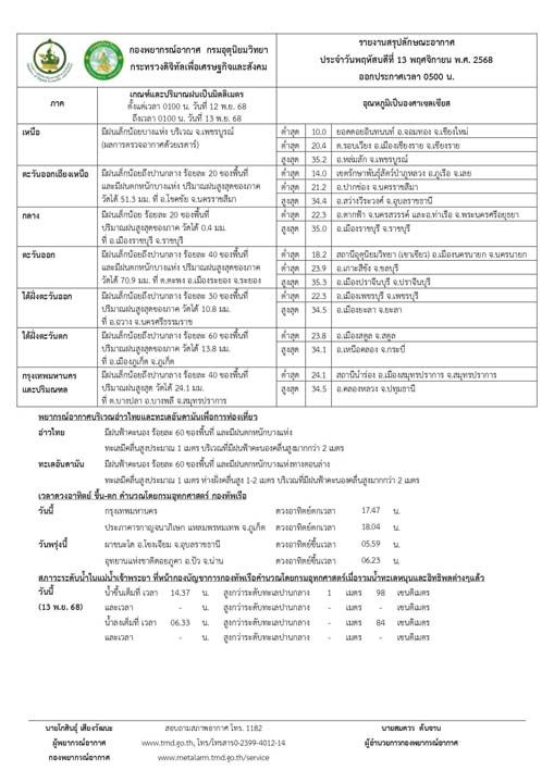 13 พฤศจิกายน 2568 กรมอุตุนิยมวิทยา รายงานลักษณะอากาศทั่วไป พยากรณ์อากาศ 24 ชั่วโมงข้างหน้า ประเทศไทยยังคงมีฝนฟ้าคะนอง และมีฝนตกหนักบางแห่งในภาคกลางตอนล่าง รวมทั้งกรุงเทพมหานครและปริมณฑล ภาคตะวันออก และภาคใต้ตอนบน ในขณะที่ภาคตะวันออกเฉียงเหนือจะมีอุณหภูมิลดลง 1-3 องศาเซลเซียส กับมีลมแรง เนื่องจากบริเวณความกดอากาศสูงหรือมวลอากาศเย็นกำลังค่อนข้างแรงจากประเทศจีนได้แผ่ลงมาปกคลุมภาคตะวันออกเฉียงเหนือตอนบนแล้ว คาดว่าจะแผ่ลงมาปกคลุมภาคตะวันออกเฉียงเหนือตอนล่าง และทะเลจีนใต้ในวันนี้ (13 พ.ย. 68) ส่งผลให้มีลมตะวันออกและลมตะวันออกเฉียงใต้พัดนำความชื้นเข้ามาปกคลุมภาคตะวันออก ภาคกลาง รวมทั้งกรุงเทพมหานครและปริมณฑล ภาคใต้ตอนบน และภาคเหนือตอนล่าง ขอให้ประชาชนในบริเวณดังกล่าวดูแลรักษาสุขภาพเนื่องจากสภาพอากาศที่เปลี่ยนแปลงไว้ด้วย