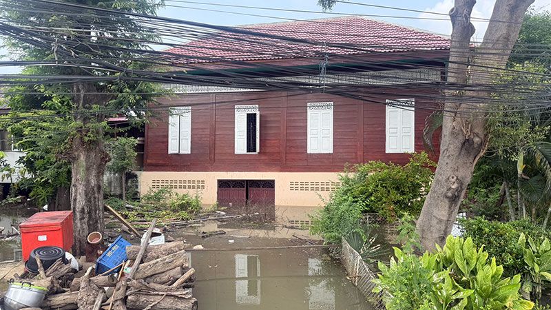 ปทุมธานีชุมชนวัดโคกวิกฤตน้ำท่วม2เดือนสูง1.50เมตรโรงเรียนต้องปิดแถมน้ำเน่าจากหมู่บ้านด้านหน้าไหลท่วมหนัก
