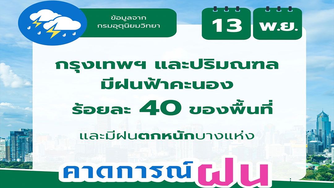 คาดการณ์แนวโน้มสถานการณ์ฝุ่น ในช่วงวันที่ 13-17 พ.ย. การระบายอากาศอยู่ในเกณฑ์ "ไม่ดี/อ่อน" ส่วนวันที่ 18-20 การระบายอากาศอยู่ในเกณฑ์ "ดี" ขณะที่ชั้นบรรยากาศใกล้ผิวพื้นมีลักษณะเปิดสลับปิด และมีโอกาสเกิดฝนตก จึงคาดว่าแนวโน้มความเข้มข้นของฝุ่นละอองมีค่าปานกลาง-ต่ำ และคาดการณ์วันนี้ มีฝนฟ้าคะนอง ร้อยละ 40 ของพื้นที่ และมีฝนตกหนักบางแห่ง