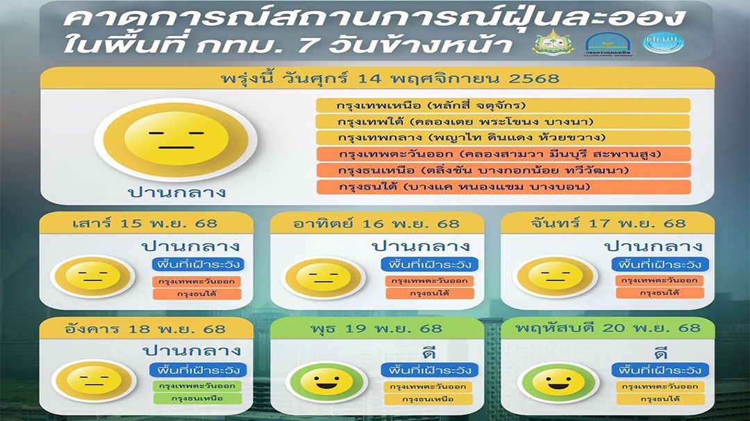 ศูนย์ข้อมูลคุณภาพอากาศกรุงเทพมหานครรายงานสถานการณ์ฝุ่น PM 2.5 ของสถานีตรวจวัดคุณภาพอากาศของกรุงเทพมหานคร วันที่ 13 พฤศจิกายน 2568 เวลา 07.00 น. ค่าเฉลี่ย 24 ชั่วโมง ของฝุ่นละอองขนาดไม่เกิน 2.5 ไมครอน (PM2.5) ตรวจวัดได้ 22.1-48.7 ไมโครกรัม/ลูกบาศก์เมตร (มคก./ลบ.ม.) พบว่าเกินมาตรฐานอยู่ในระดับสีส้ม เริ่มมีผลกระทบต่อสุขภาพ (มาตรฐานไม่เกิน 37.5 มคก./ลบ.ม.) จำนวน 10 พื้นที่ คือ