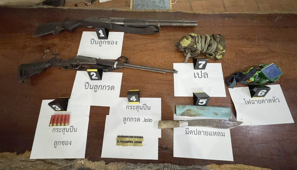 พร้อมตรวจยึดของกลาง 7 รายการ ประกอบด้วย อาวุธปืนลูกซอง 5 นัด (ไม่มีเลขทะเบียน) 1 กระบอก อาวุธปืนยาวเดี่ยวลูกกรด .22 LR (ไม่มีเลขทะเบียน) 1 กระบอก เครื่องกระสุนปืนลูกซอง 5 นัด เครื่องกระสุนปืนขนาด .22 จำนวน 44 นัด มีด 1 เล่ม เปลนอน 1 ผืน และไฟฉายคาดศรีษะ 1 อัน