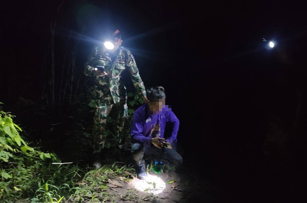 โดยเมื่อวันที่ 12 พ.ย. 68 เวลา 20.00 น.ตนได้มอบหมายให้นายอำพล ไหลยิ้ม พนักงานพิทักษ์ป่า พร้อมเจ้าหน้าที่สายตรวจส่วนกลาง นำกำลังออกลาดตระเวนด้วยรถจักรยานยนต์ไปตามเส้นทางรับผิดชอบ จนกระทั้งเวลา 04.40 น.รุ่งเช้าวันนี้ (13 พ.ย.) เมื่อเจ้าหน้าที่ไปถึงบริเวณป่าพุตะแบก ท้องที่หมู่ 1 ต.แม่กระบุง อ.ศรีสวัสดิ์ จ.กาญจนบุรี ในเขตอุทยานแห่งชาติเขื่อนศรีนครินทร์ เจ้าหน้าที่สังเกตเห็นแสงไฟส่องทางอยู่บริเวณชายไร่ เจ้าหน้าที่คาดว่าน่าจะเป็นกลุ่มนายพรานเข้ามาลักลอบล่าสัตว์ป่า