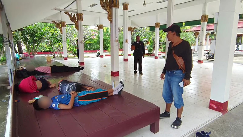 นายแดง สัปเหร่อวัดโพธิวราราม เปิดเผยว่า เช้าวันนี้ขณะกำลังจะมาทำความสะอาดศาลาธรรมสังเวช เพื่อเตรียมสถานที่จัดพิธีบำเพ็ญกุศลศพ พอมาถึงก็พบเด็กชาย 3 คน นอนรวมกันอยู่บริเวณศาลาในสภาพน่าสงสาร หนาวสั่นไปทั้งตัว จึงเข้าไปปลุกและสอบถาม ทราบว่าเด็กทั้งหมดมีบ้านและอยู่ในวัยเรียน แต่ไม่ไปโรงเรียนตามปกติ