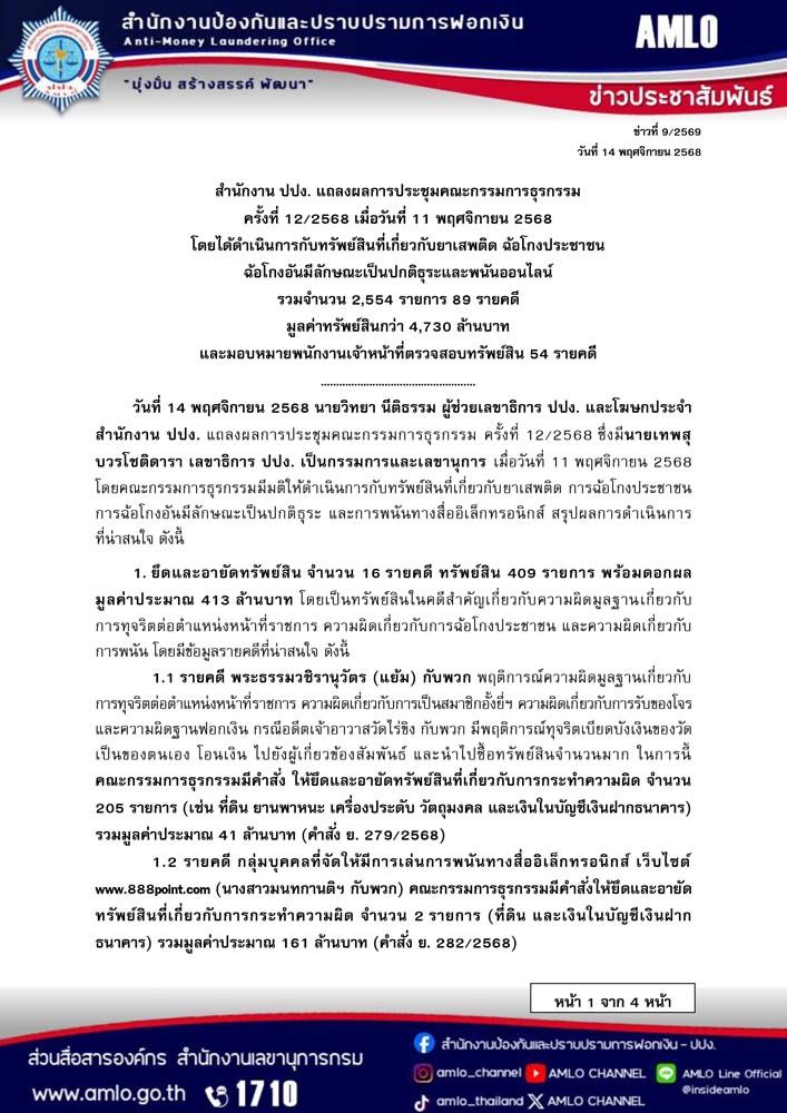 1.2 รายคดี กลุ่มบุคคลที่จัดให้มีการเล่นการพนันทางสื่ออิเล็กทรอนิกส์ เว็บไซต์ www.888point.com (นางสาวมนทกานติฯ กับพวก) คณะกรรมการธุรกรรมมีคำสั่งให้ยึดและอายัดทรัพย์สินที่เกี่ยวกับการกระทำความผิด จำนวน 2 รายการ (ที่ดิน และเงินในบัญชีเงินฝากธนาคาร) รวมมูลค่าประมาณ 161 ล้านบาท (คำสั่ง ย. 282/2568)