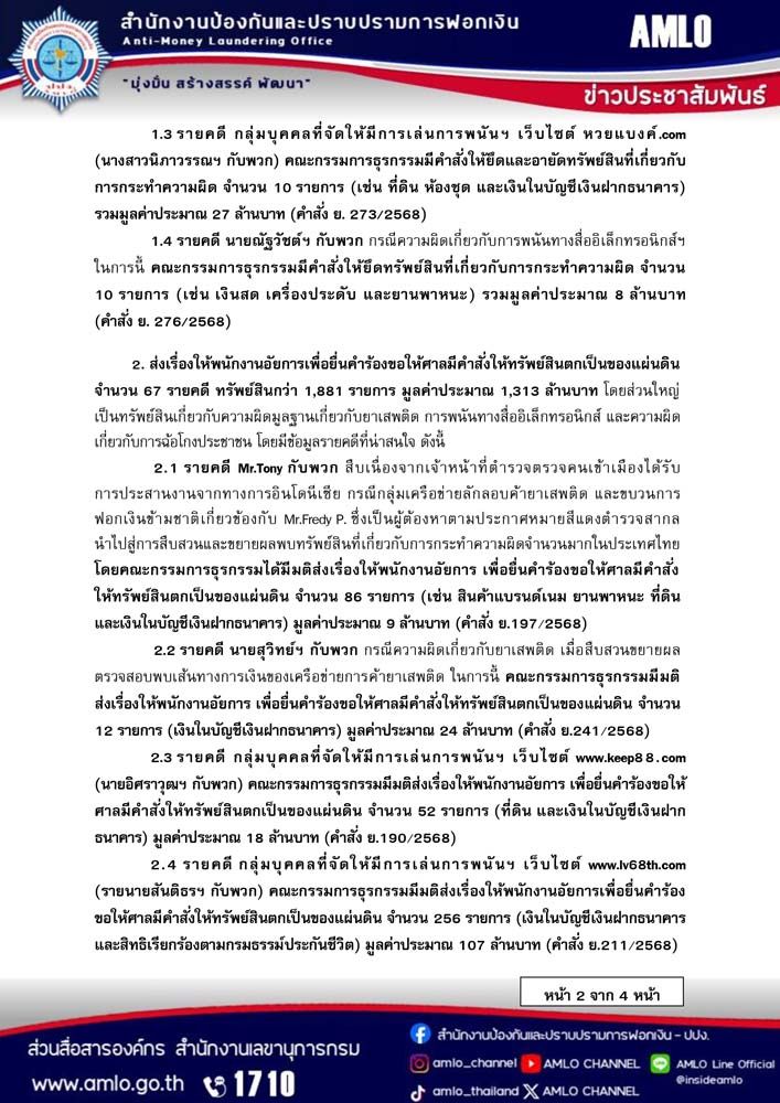 2.4 รายคดี กลุ่มบุคคลที่จัดให้มีการเล่นการพนันฯ เว็บไซต์ www.lv68th.com (รายนายสันติธรฯ กับพวก) คณะกรรมการธุรกรรมมีมติส่งเรื่องให้พนักงานอัยการเพื่อยื่นคำร้องขอให้ศาลมีคำสั่งให้ทรัพย์สินตกเป็นของแผ่นดิน จำนวน 256 รายการ (เงินในบัญชีเงินฝากธนาคาร และสิทธิเรียกร้องตามกรมธรรม์ประกันชีวิต) มูลค่าประมาณ 107 ล้านบาท (คำสั่ง ย.211/2568)