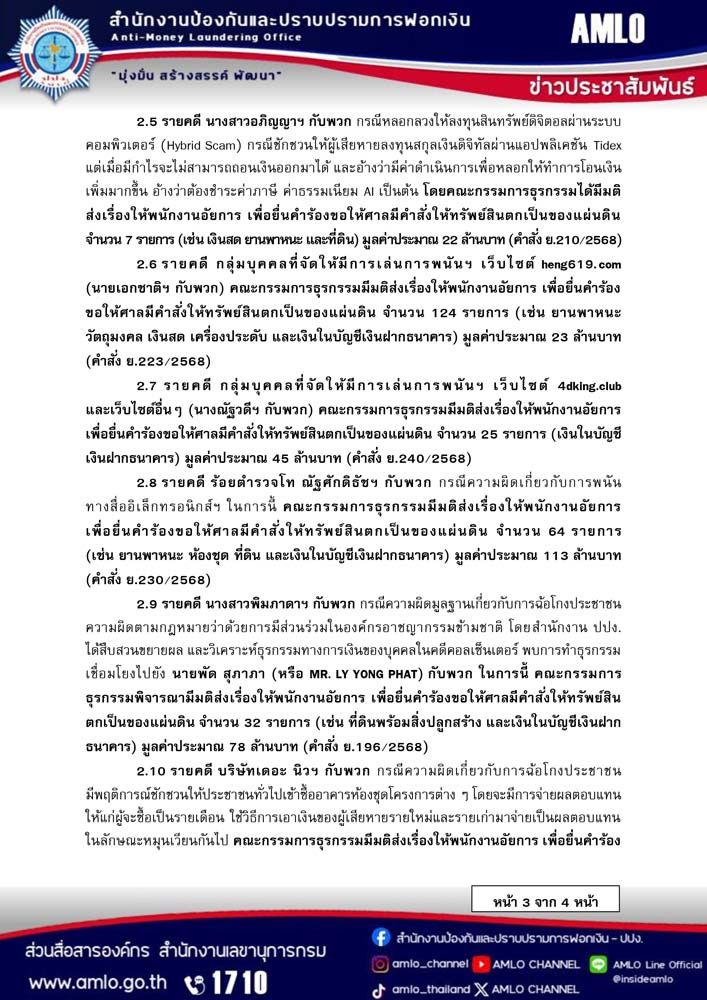 2.9 รายคดี นางสาวพิมภาดาฯ กับพวก กรณีความผิดมูลฐานเกี่ยวกับการฉ้อโกงประชาชนความผิดตามกฎหมายว่าด้วยการมีส่วนร่วมในองค์กรอาชญากรรมข้ามชาติ โดยสำนักงาน ปปง. ได้สืบสวนขยายผล และวิเคราะห์ธุรกรรมทางการเงินของบุคคลในคดีคอลเซ็นเตอร์ พบการทำธุรกรรมเชื่อมโยงไปยัง นายพัด สุภาภา (หรือ MR. LY YONG PHAT) กับพวก ในการนี้ คณะกรรมการธุรกรรมพิจารณามีมติส่งเรื่องให้พนักงานอัยการ เพื่อยื่นคำร้องขอให้ศาลมีคำสั่งให้ทรัพย์สินตกเป็นของแผ่นดิน จำนวน 32 รายการ (เช่น ที่ดินพร้อมสิ่งปลูกสร้าง และเงินในบัญชีเงินฝากธนาคาร) มูลค่าประมาณ 78 ล้านบาท (คำสั่ง ย.196/2568)
