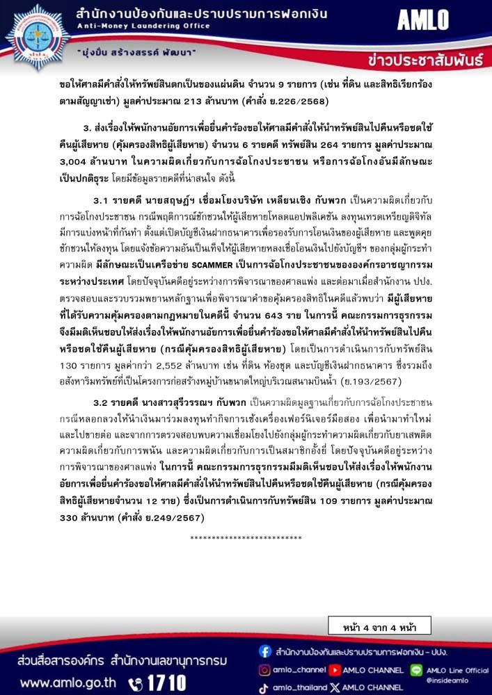 3.1 รายคดี นายสฤษฎ์ฯ เชื่อมโยงบริษัท เหลียนเซิง กับพวก เป็นความผิดเกี่ยวกับการฉ้อโกงประชาชน กรณีพฤติการณ์ชักชวนให้ผู้เสียหายโหลดแอปพลิเคชัน ลงทุนเทรดเหรียญดิจิทัล มีการแบ่งหน้าที่กันทำ ตั้งแต่เปิดบัญชีเงินฝากธนาคารเพื่อรองรับการโอนเงินของผู้เสียหาย และพูดคุยชักชวนให้ลงทุน โดยแจ้งข้อความอันเป็นเท็จให้ผู้เสียหายหลงเชื่อโอนเงินไปยังบัญชีฯ ของกลุ่มผู้กระทำความผิด มีลักษณะเป็นเครือข่าย SCAMMER เป็นการฉ้อโกงประชาชนขององค์กรอาชญากรรมระหว่างประเทศ โดยปัจจุบันคดีอยู่ระหว่างการพิจารณาของศาลแพ่ง และต่อมาเมื่อสำนักงาน ปปง. ตรวจสอบและรวบรวมพยานหลักฐานเพื่อพิจารณาคำขอคุ้มครองสิทธิในคดีแล้วพบว่า มีผู้เสียหายที่ได้รับความคุ้มครองตามกฎหมายในคดีนี้ จำนวน 643 ราย ในการนี้ คณะกรรมการธุรกรรม จึงมีมติเห็นชอบให้ส่งเรื่องให้พนักงานอัยการเพื่อยื่นคำร้องขอให้ศาลมีคำสั่งให้นำทรัพย์สินไปคืนหรือชดใช้คืนผู้เสียหาย (กรณีคุ้มครองสิทธิผู้เสียหาย) โดยเป็นการดำเนินการกับทรัพย์สิน 130 รายการ มูลค่ากว่า 2,552 ล้านบาท เช่น ที่ดิน ห้องชุด และบัญชีเงินฝากธนาคาร ซึ่งรวมถึงอสังหาริมทรัพย์ที่เป็นโครงการก่อสร้างหมู่บ้านขนาดใหญ่บริเวณสนามบินน้ำ (ย.193/2567)