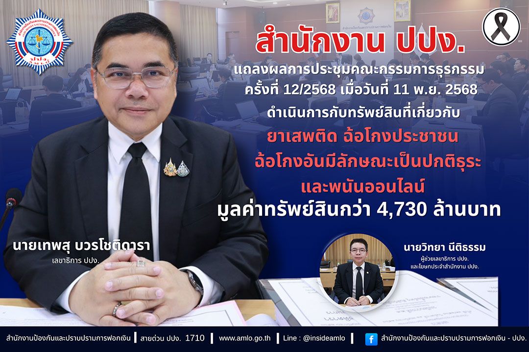 เมื่อวันที่ 14 พฤศจิกายน 2568 นายวิทยา นีติธรรม ผู้ช่วยเลขาธิการ ปปง.และโฆษกประจำสำนักงาน ปปง.แถลงผลการประชุมคณะกรรมการธุรกรรม ครั้งที่ 12/2568 ซึ่งมี นายเทพสุ บวรโชติดารา เลขาธิการ ปปง.เป็นกรรมการและเลขานุการ เมื่อวันที่ 11 พฤศจิกายน 2568 โดยคณะกรรมการธุรกรรมมีมติให้ดำเนินการกับทรัพย์สินที่เกี่ยวกับยาเสพติด การฉ้อโกงประชาชน การฉ้อโกงอันมีลักษณะเป็นปกติธุระ และการพนันทางสื่ออิเล็กทรอนิกส์ สรุปผลการดำเนินการที่น่าสนใจ ดังนี้